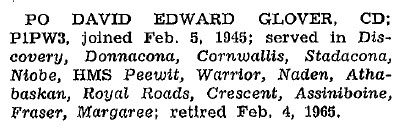 GLOVER, David Edward - born February 26, 1927 in Vancouver, BC, passed away on January 2, 1999. He is survived by his family, Diane, David, Steven and Judith. David served with the RCN from 1945 - 1965 as a pay writer and saw service on HMCS ATHABASKAN during the Korean War. he also served at Royal Roads Military College from 1953-1955. Private cremation. Flowers gratefully declined. If desired donations may be made to the Salvation Army.
