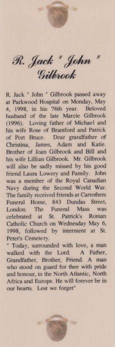 GILBROOK, Ronald John (Jack) - Born on October 13, 1922 in London, Ontario, to JFL Gilbrook and Hester Milligan. John was the oldest of three children. He attended Aberdeen Public School and HB Beal Technical School. In his late-teens, he worked as a delivery driver for Siegel'sWholesale Fruit out of London.