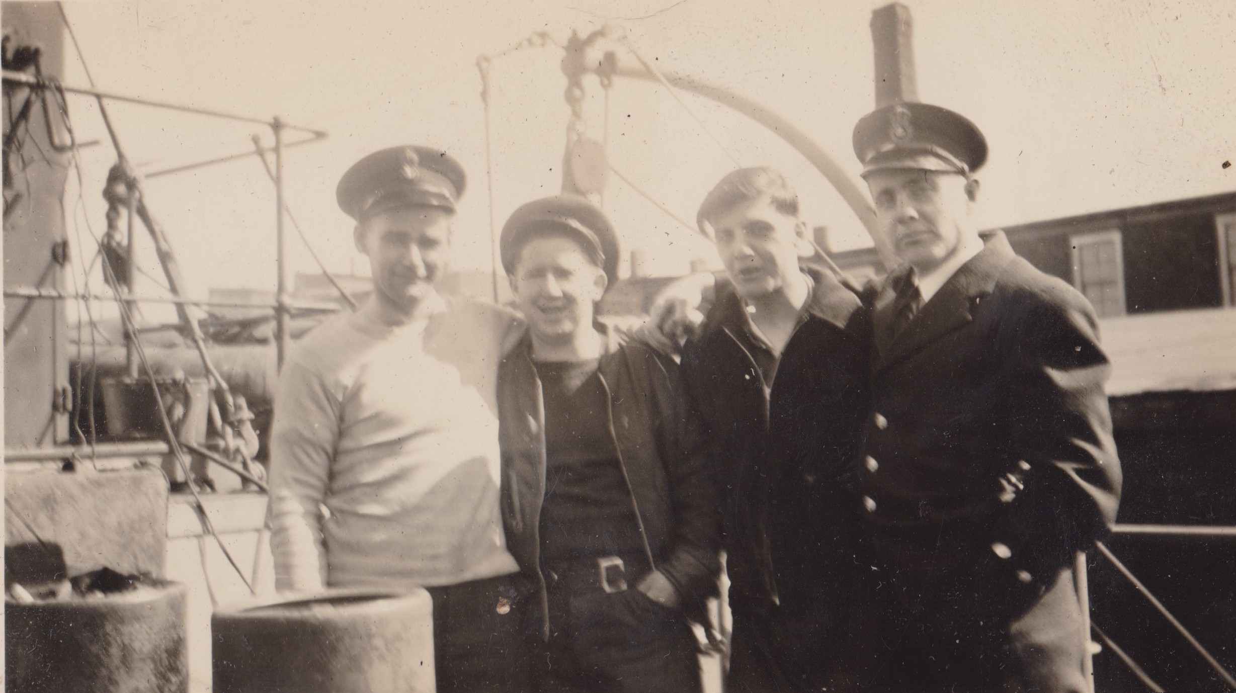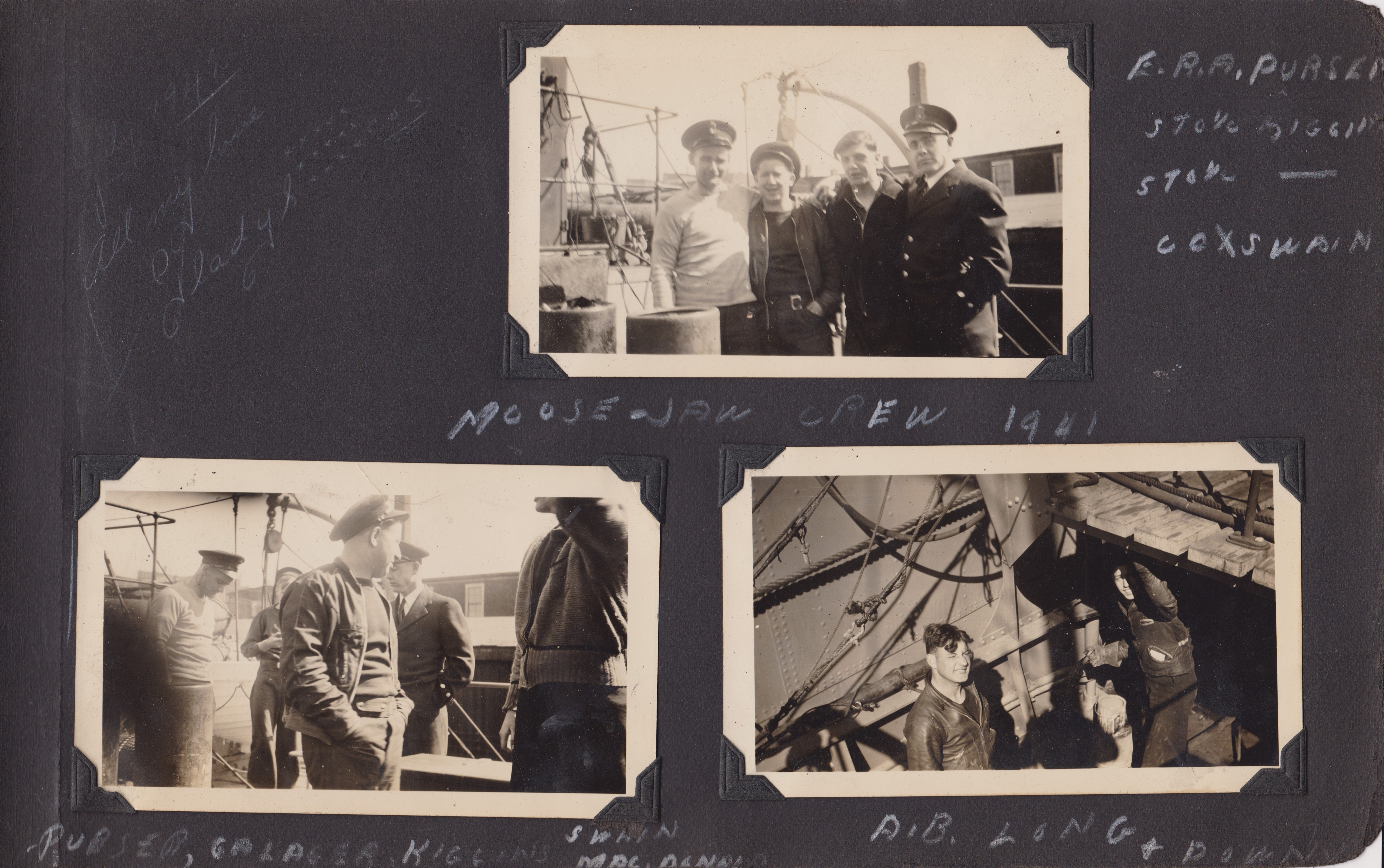(RJG011) Album page 1 - HMCS MOOSE JAW K164 - 1941 (RJG012) ERA Purser, Sto 1/c Kiggins, unknown Sto 1c, Coxswain MacDonald on HMCS MOOSE JAW K164 (RJG013) Purser, Galager, Kiggins. Coxswain MacDonald on HMCS MOOSE JAW K164 (RJG014) AB Long and Downy on HMCS MOOSE JAW K164