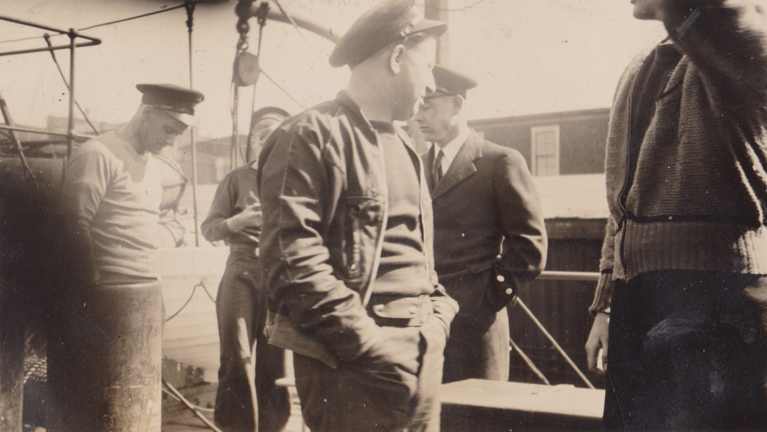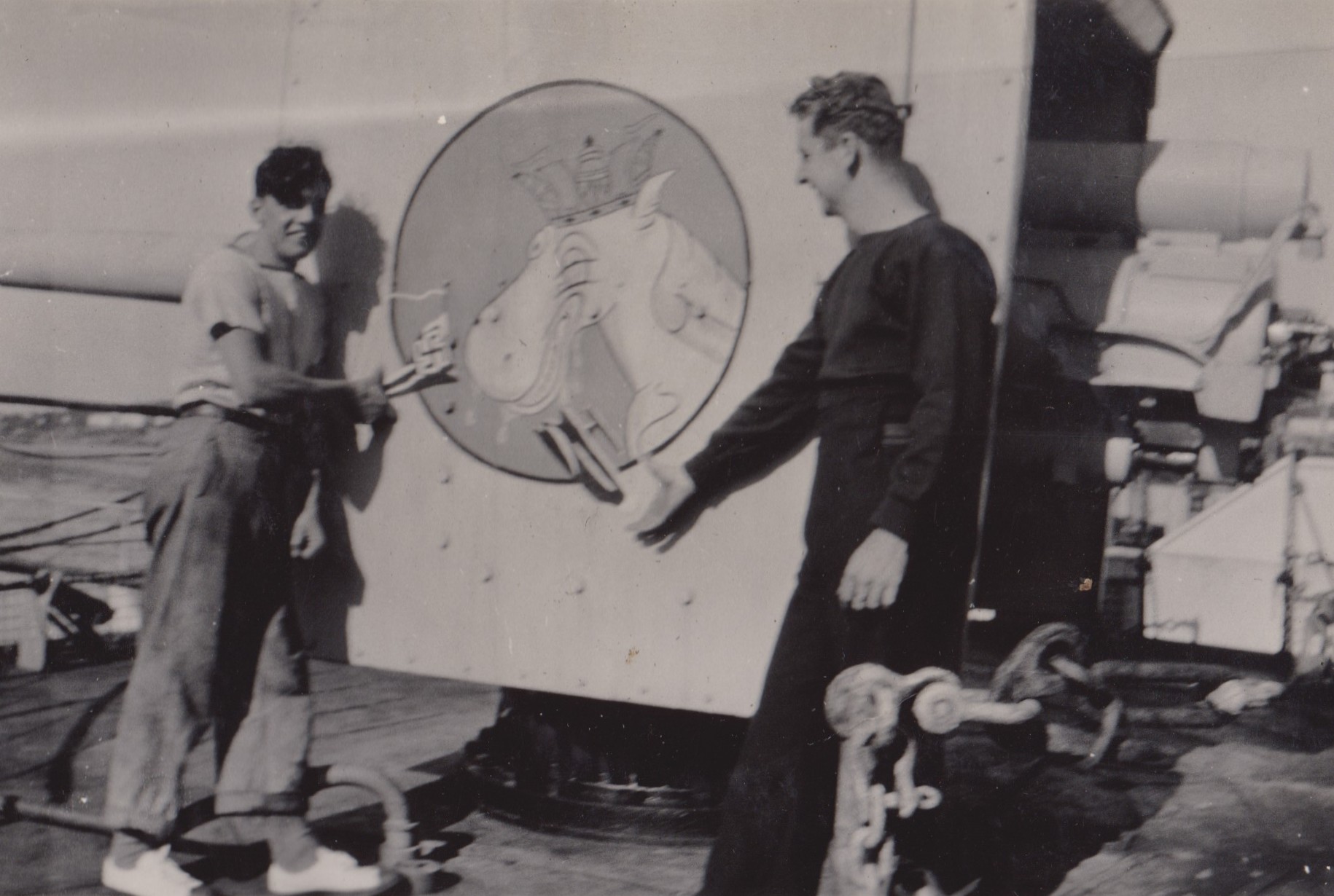 (RJG009) Higgins on HMCS MOOSE JAW K164 (RJG010) Unknown sailor wearing a jacket with HMCS MOOSE JAW on it along with various phrases written on it