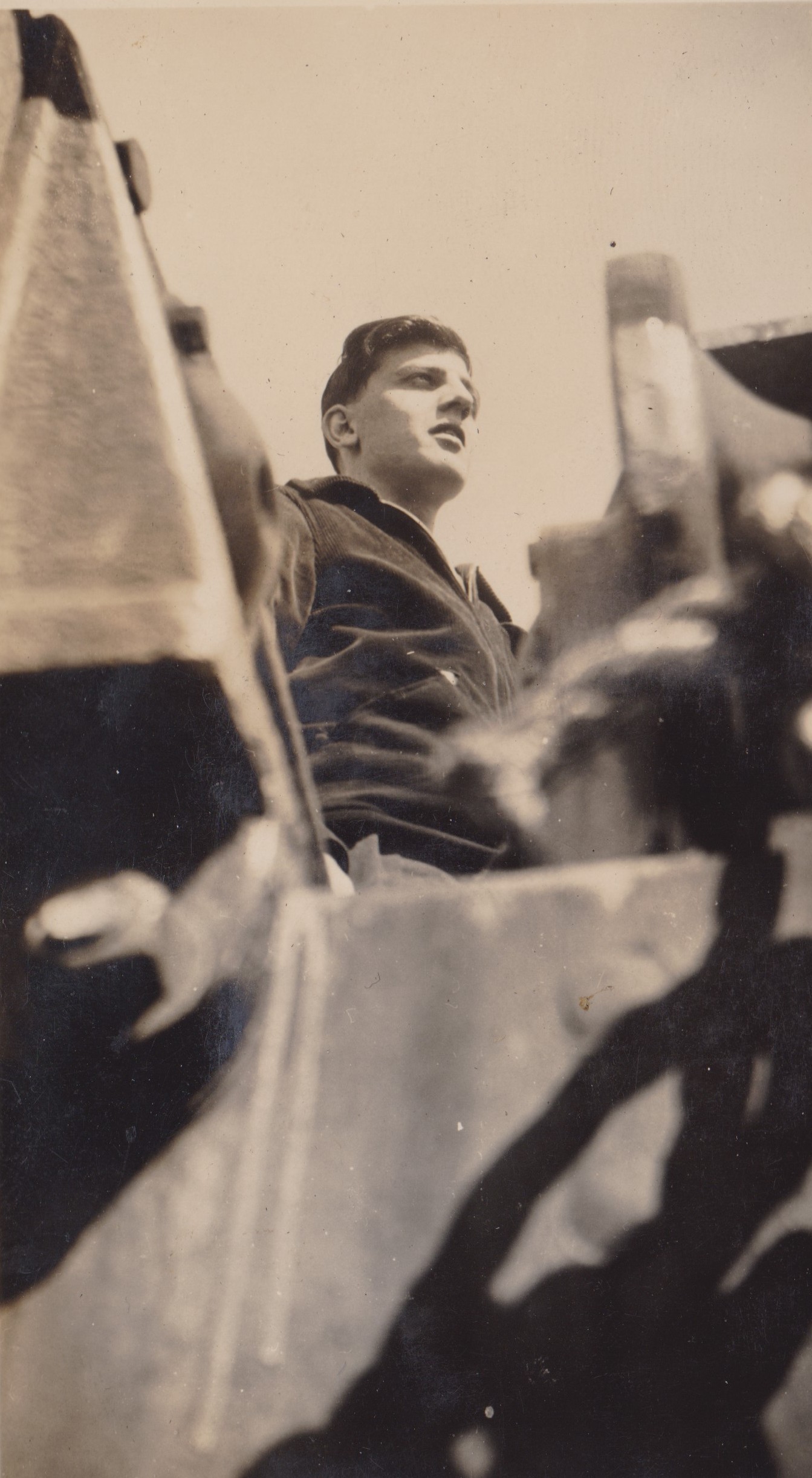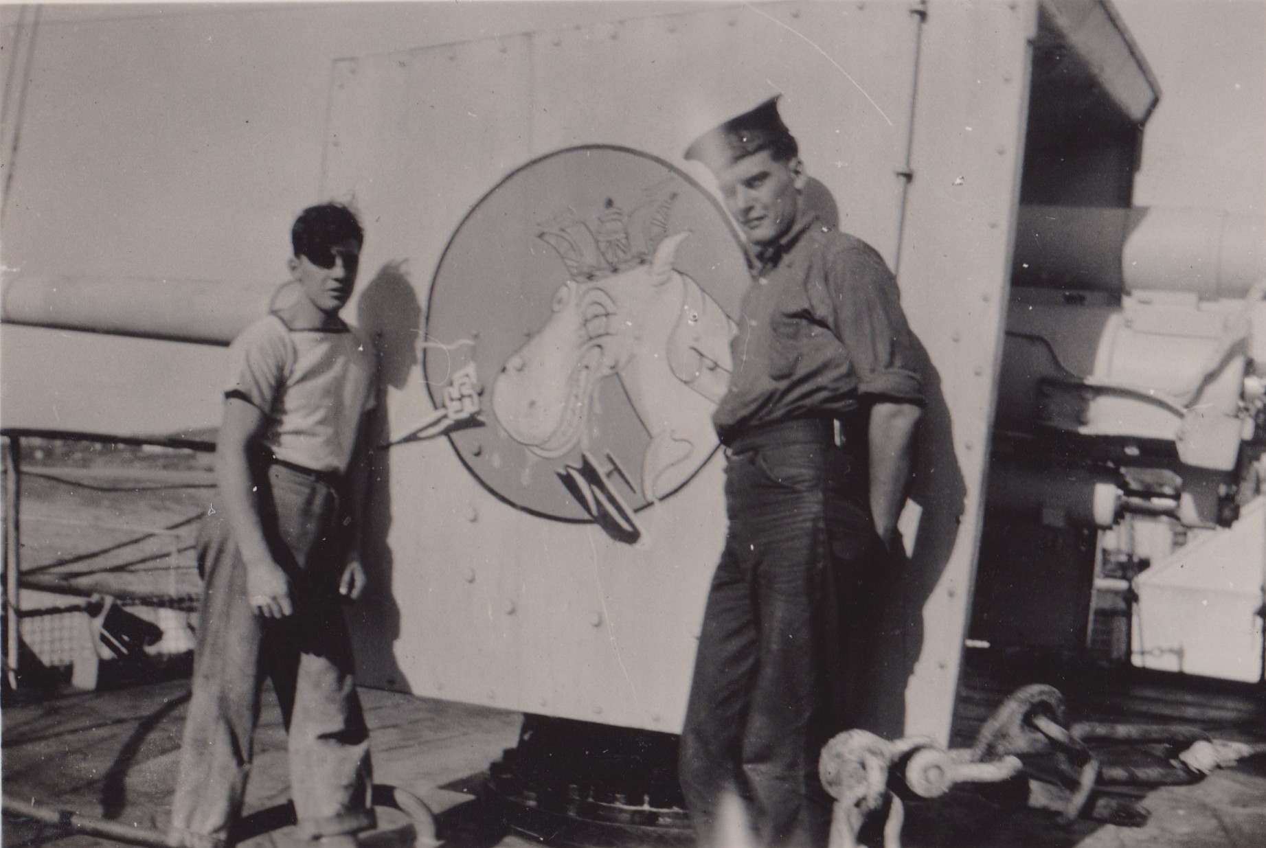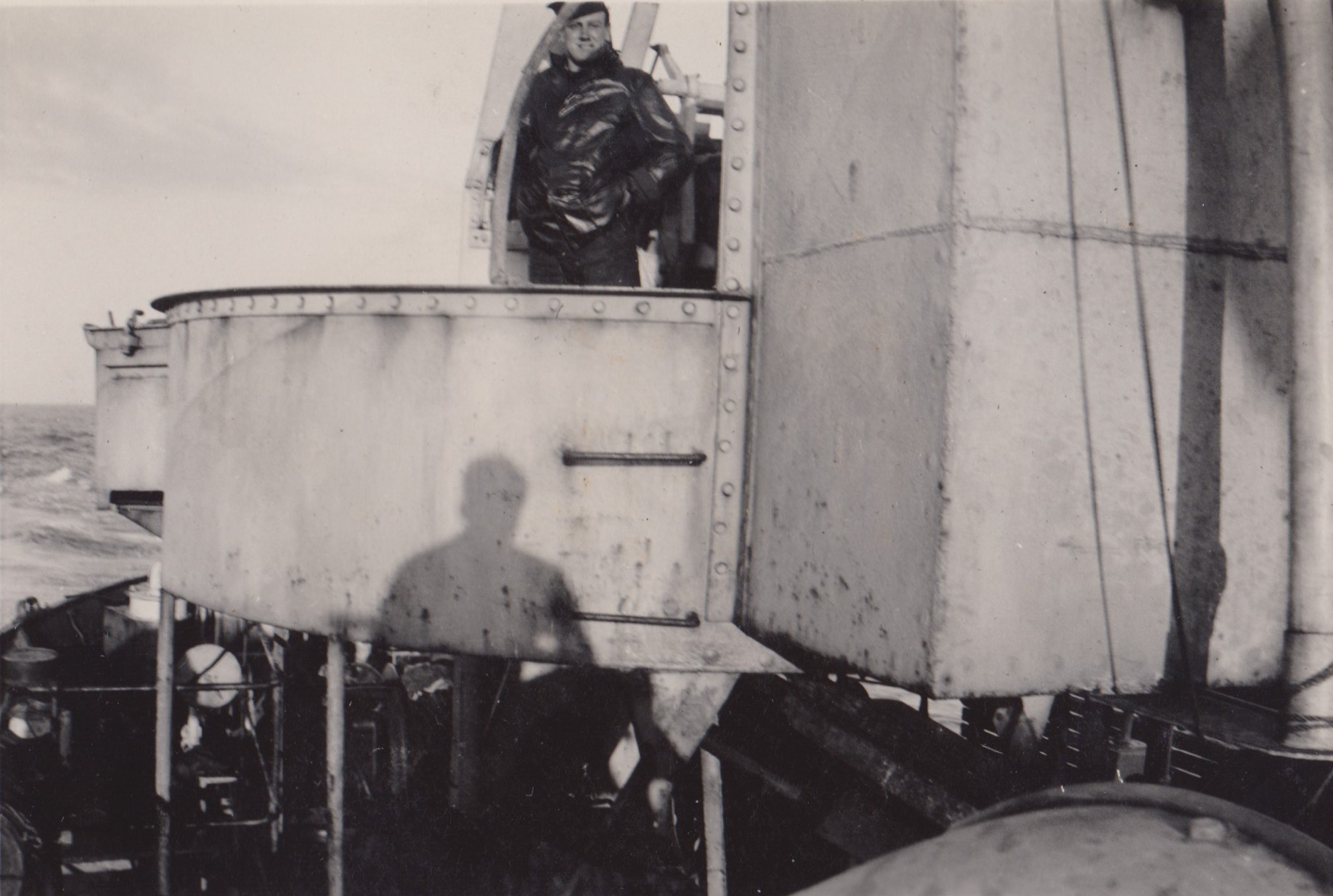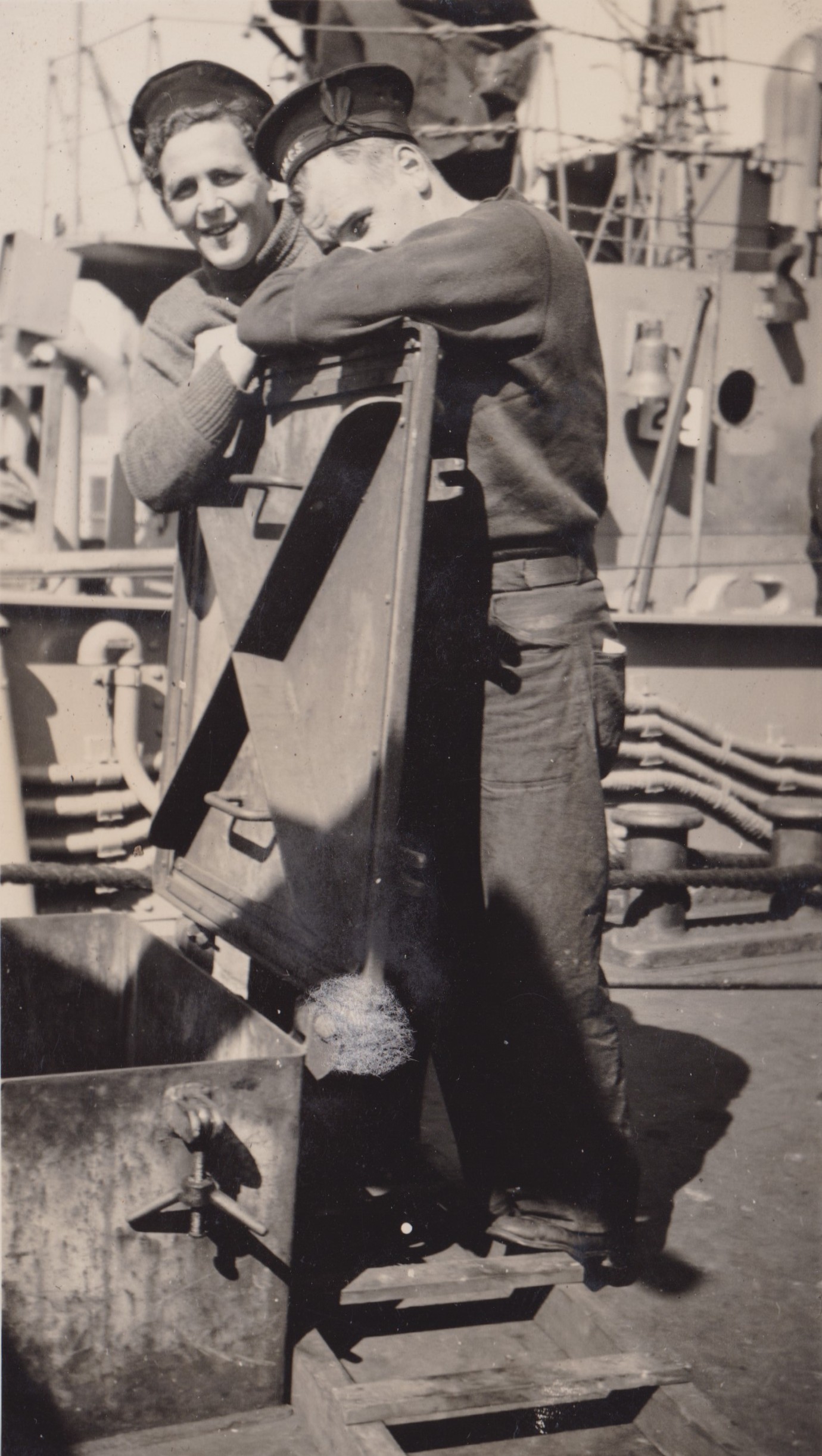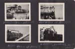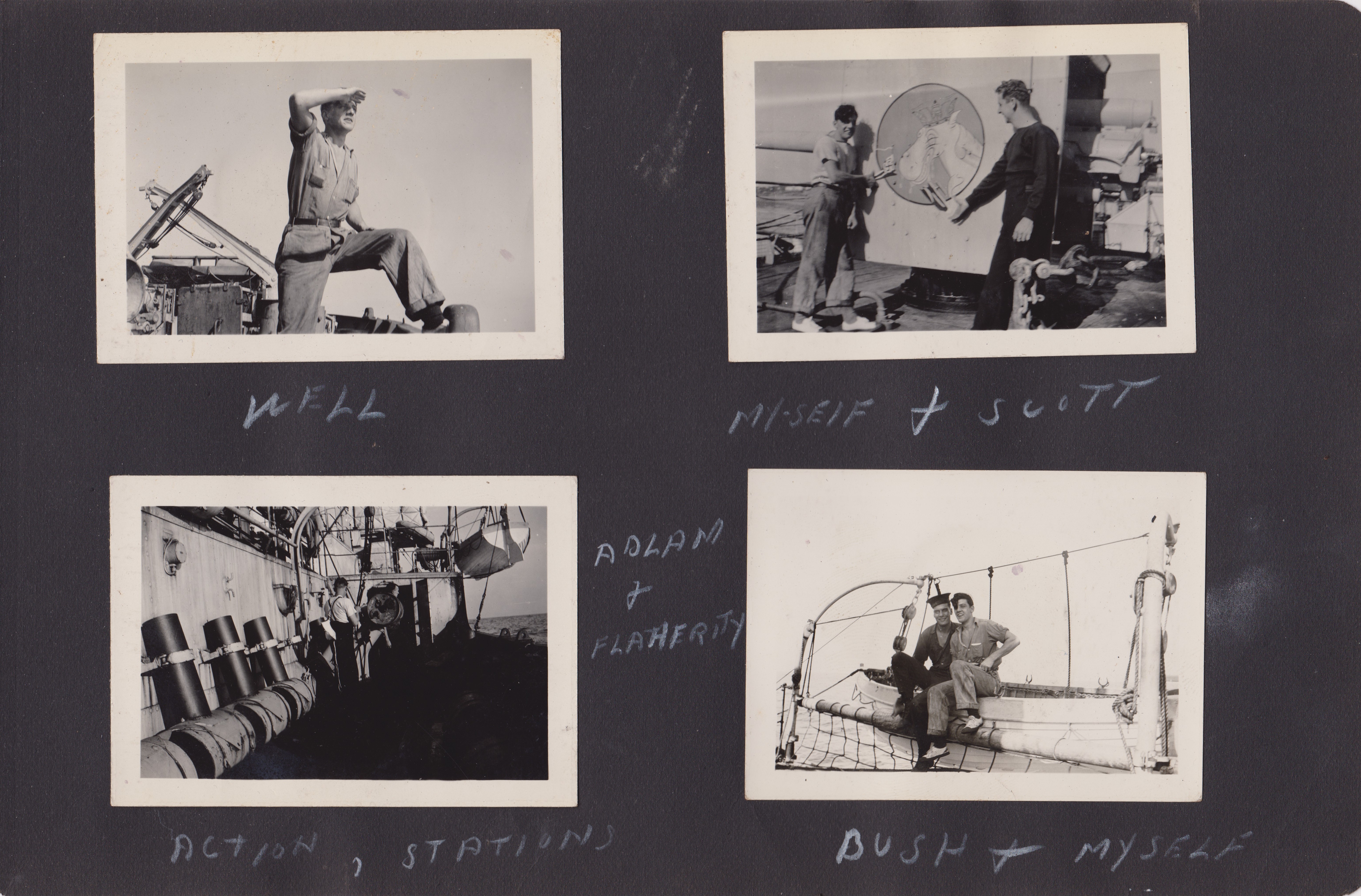 (RJG027) Album page 4 - HMCS SOREL K153 (RJG028) "Well" on HMCS SOREL K153 (RJG029) "Action Stations" Unknown sailors by a depth charge launcher on HMCS SOREL K153 (RJG030) Jack Gilbrook and Scott by the gunshield art on HMCS SOREL K153 (RJG031) Bush and Jack Gilbrook sitting on the ship's boat on HMCS SOREL K153