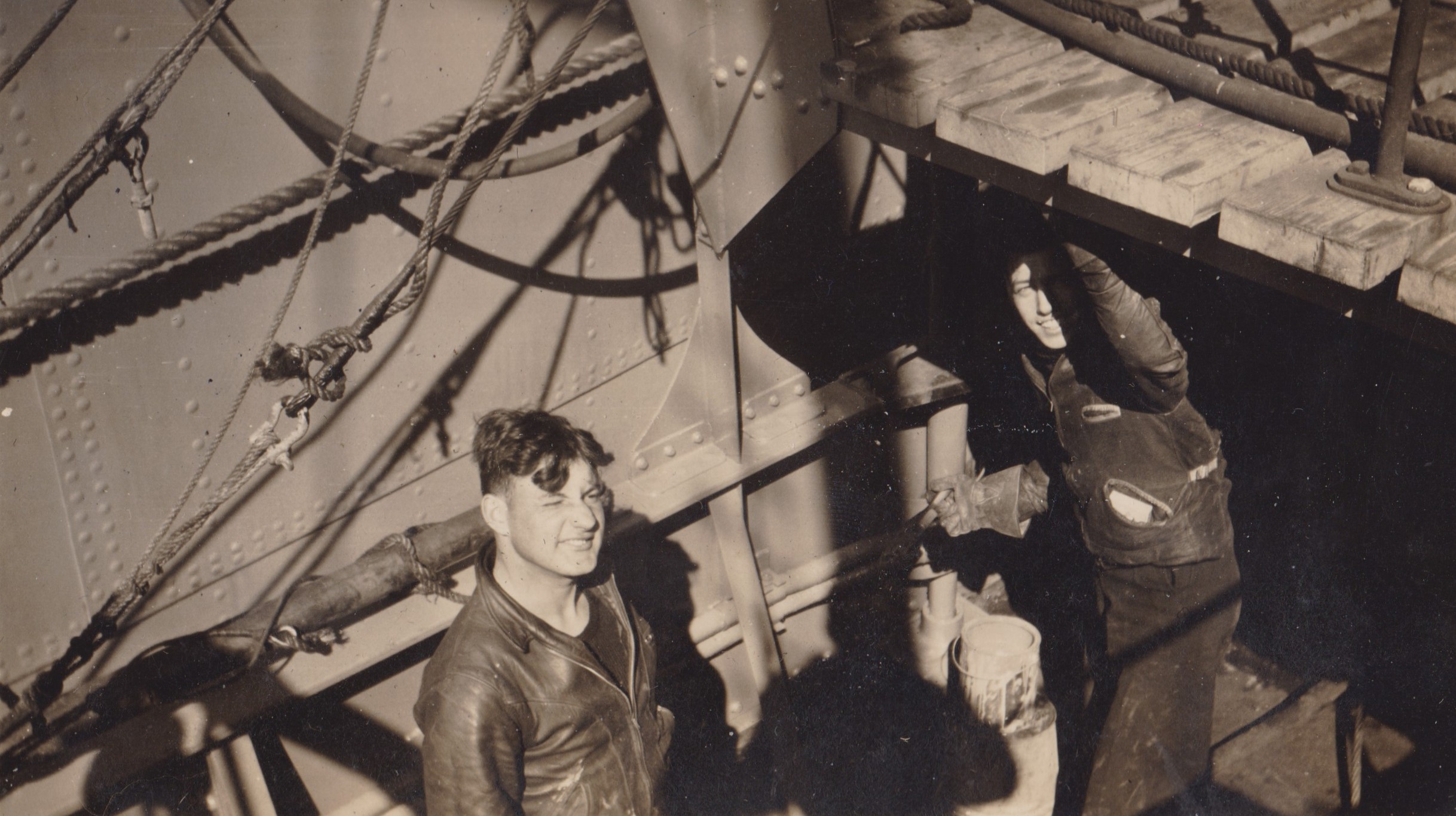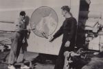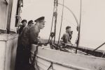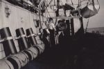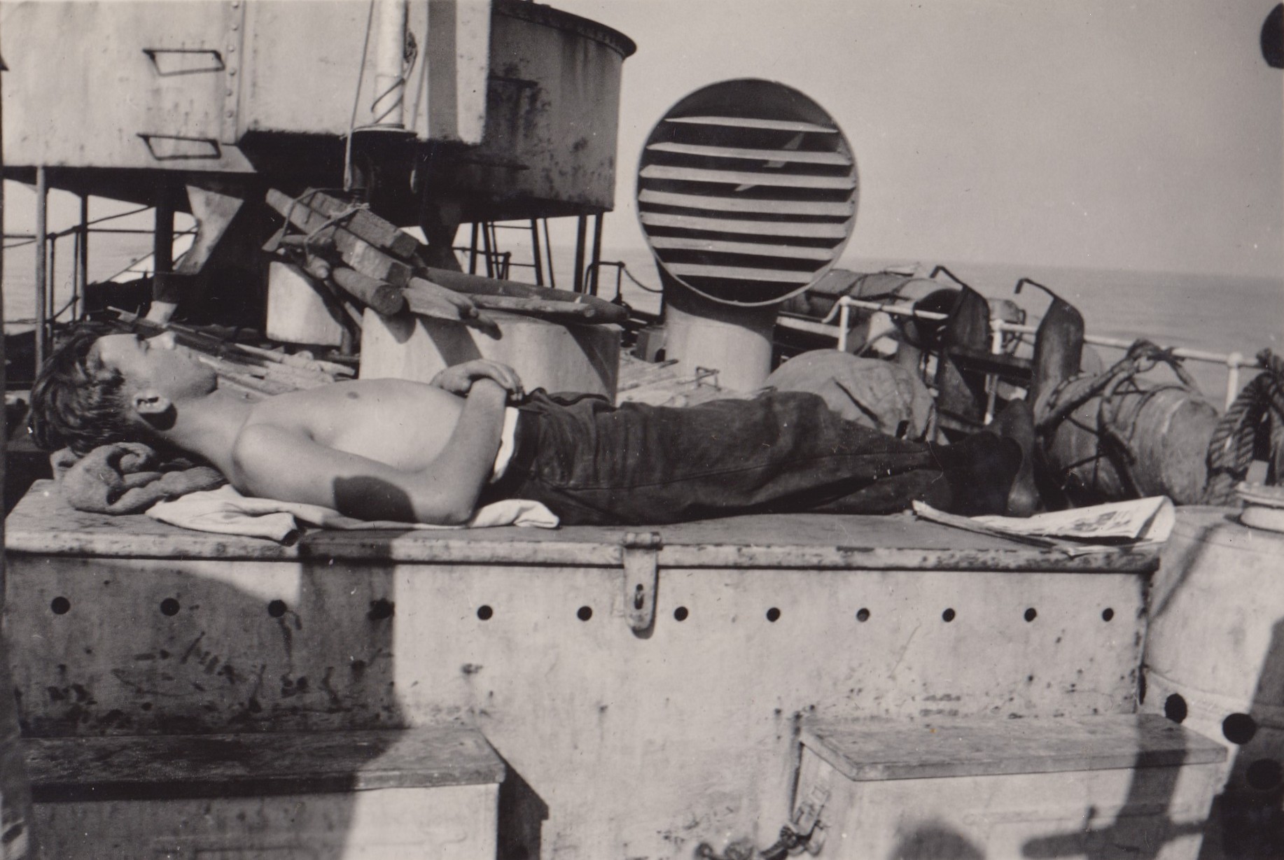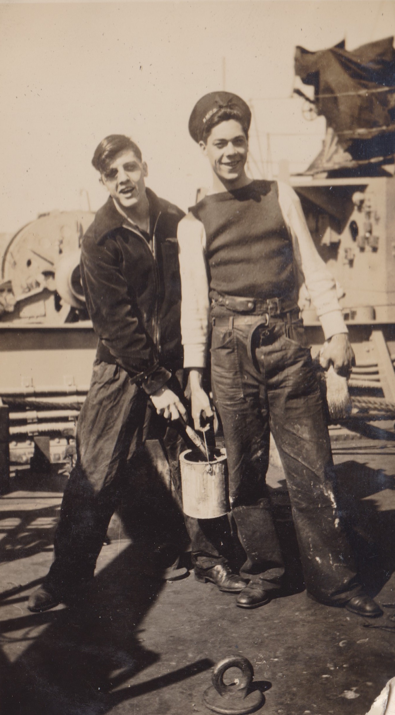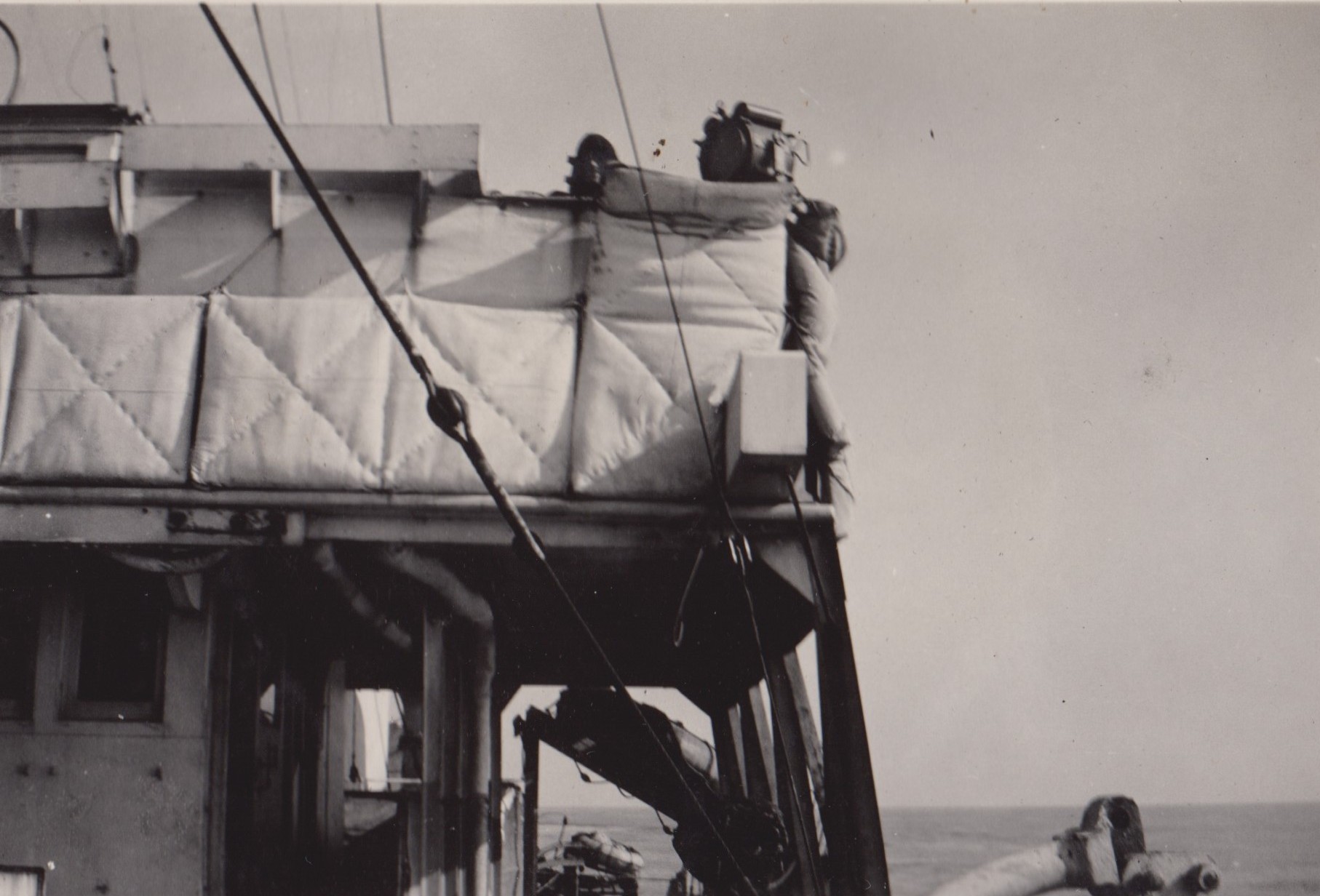 (RJG027) Album page 4 - HMCS SOREL K153 (RJG028) "Well" on HMCS SOREL K153 (RJG029) "Action Stations" Unknown sailors by a depth charge launcher on HMCS SOREL K153 (RJG030) Jack Gilbrook and Scott by the gunshield art on HMCS SOREL K153 (RJG031) Bush and Jack Gilbrook sitting on the ship's boat on HMCS SOREL K153