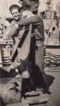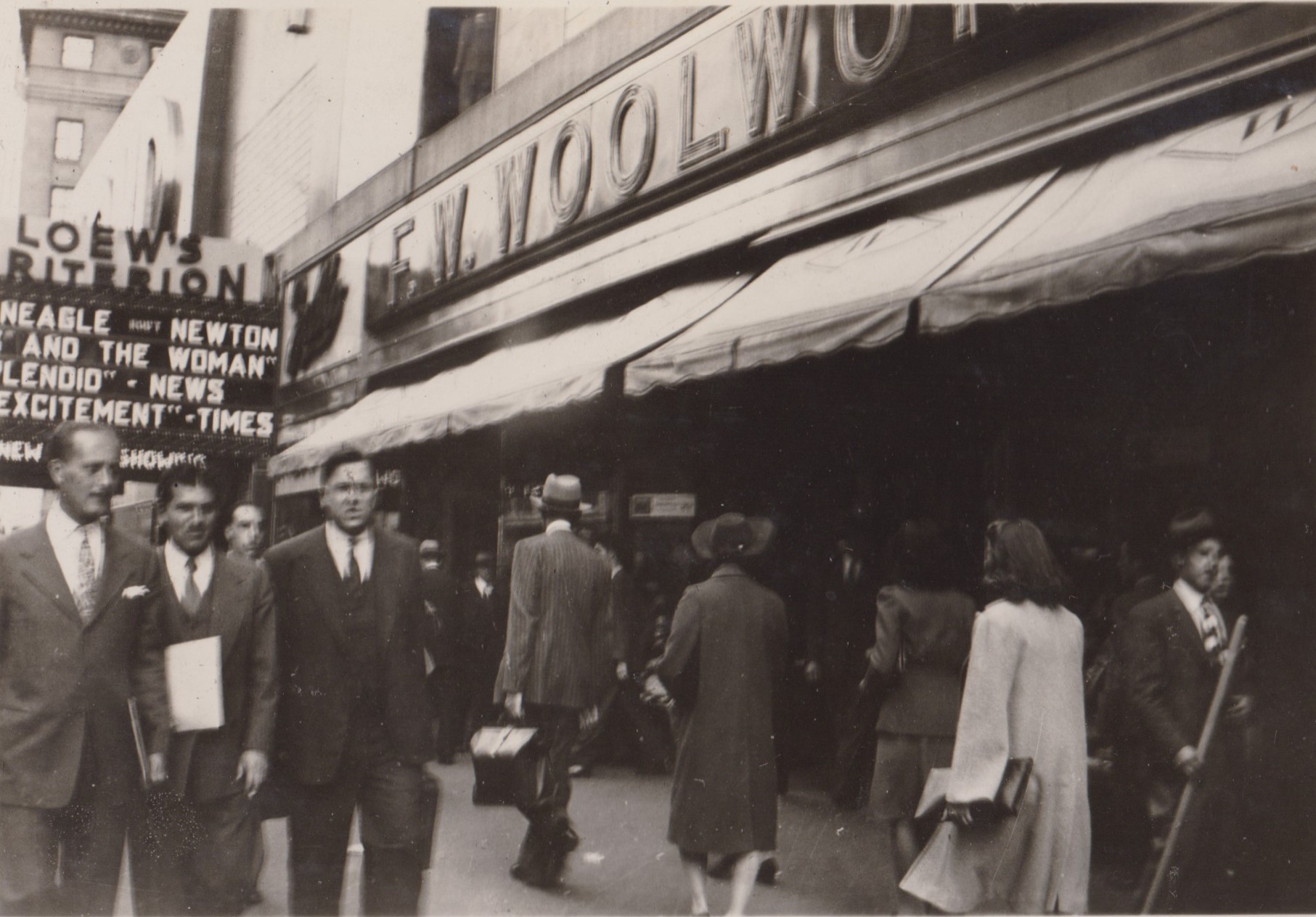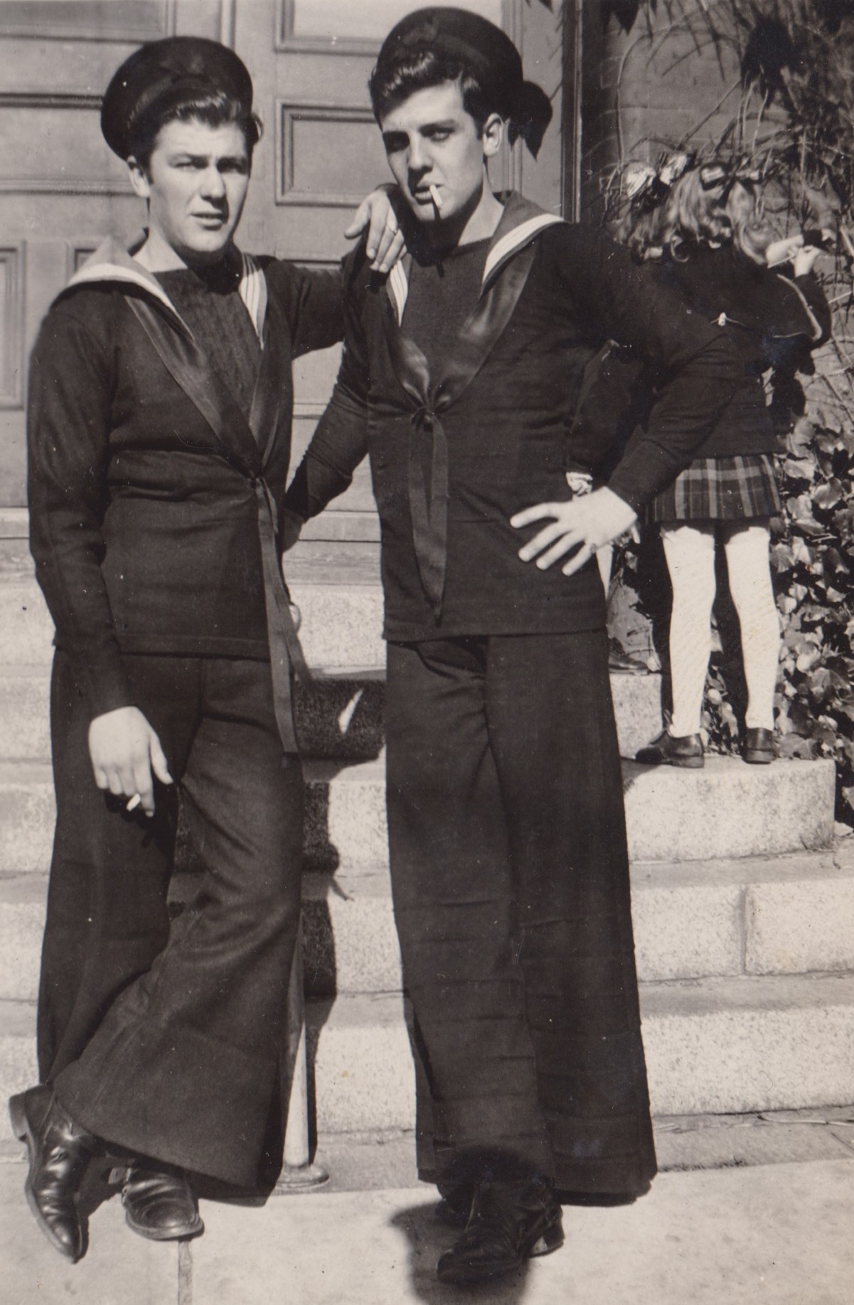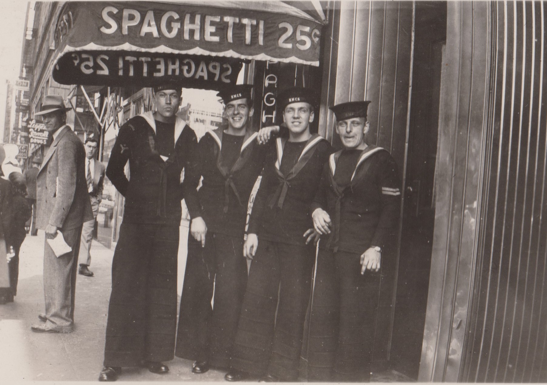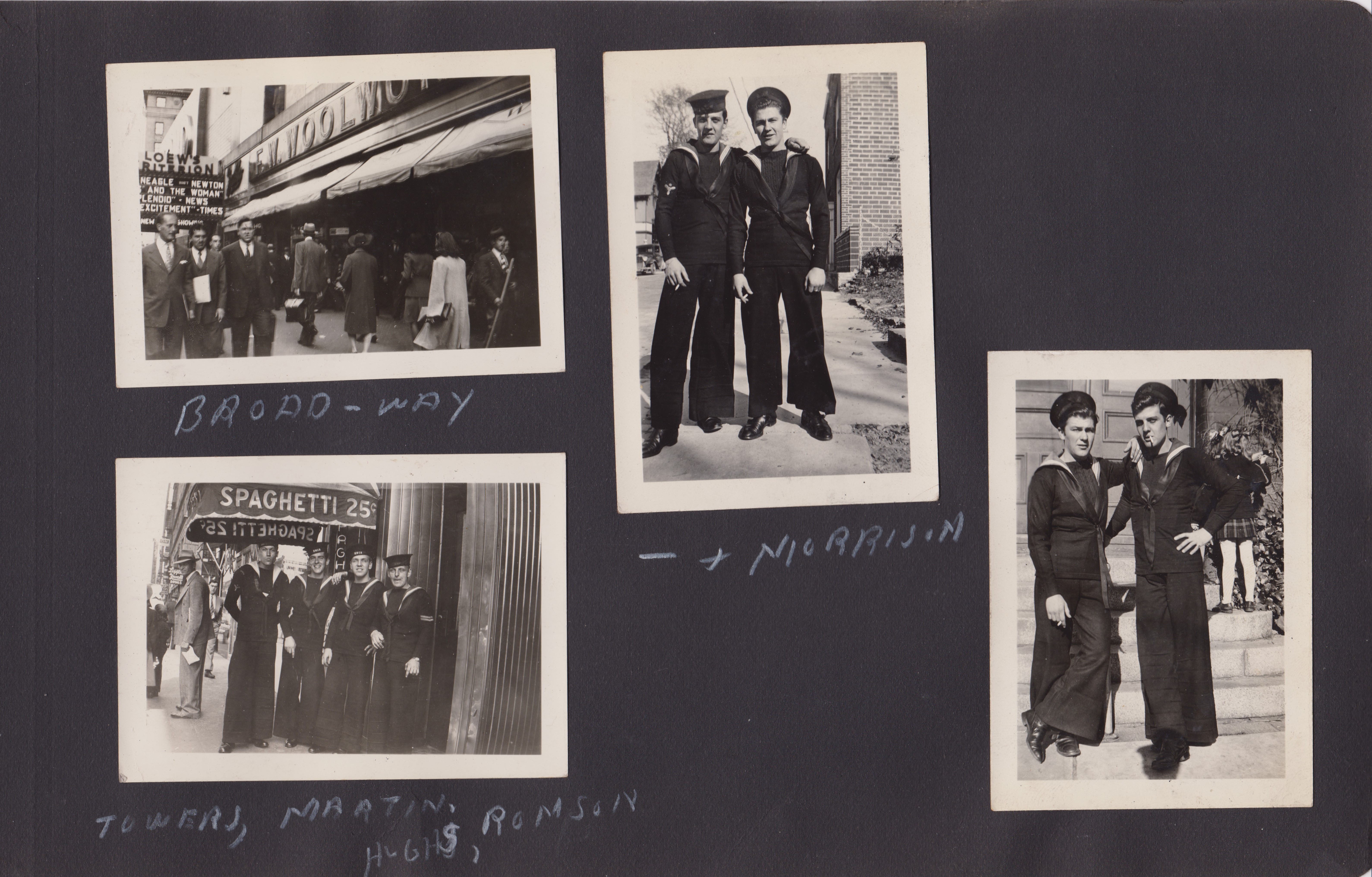 (RJG038) Album page 6 - Sailors ashore (RJG039) Lowe's Criterion and F.W. Woolworth on Broadway, New York, NY, USA (RJG040) Towers, Martin, Hughs and Romson ashore in front of a restaurant advertising Spaghetti 25¢ - believed to be taken in New York City. (RJG041) Morrison (right) with unknown friend/shipmate - location unknown (RJG042) Morrison (left) and Jack Gilbrook - location unknown