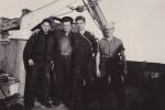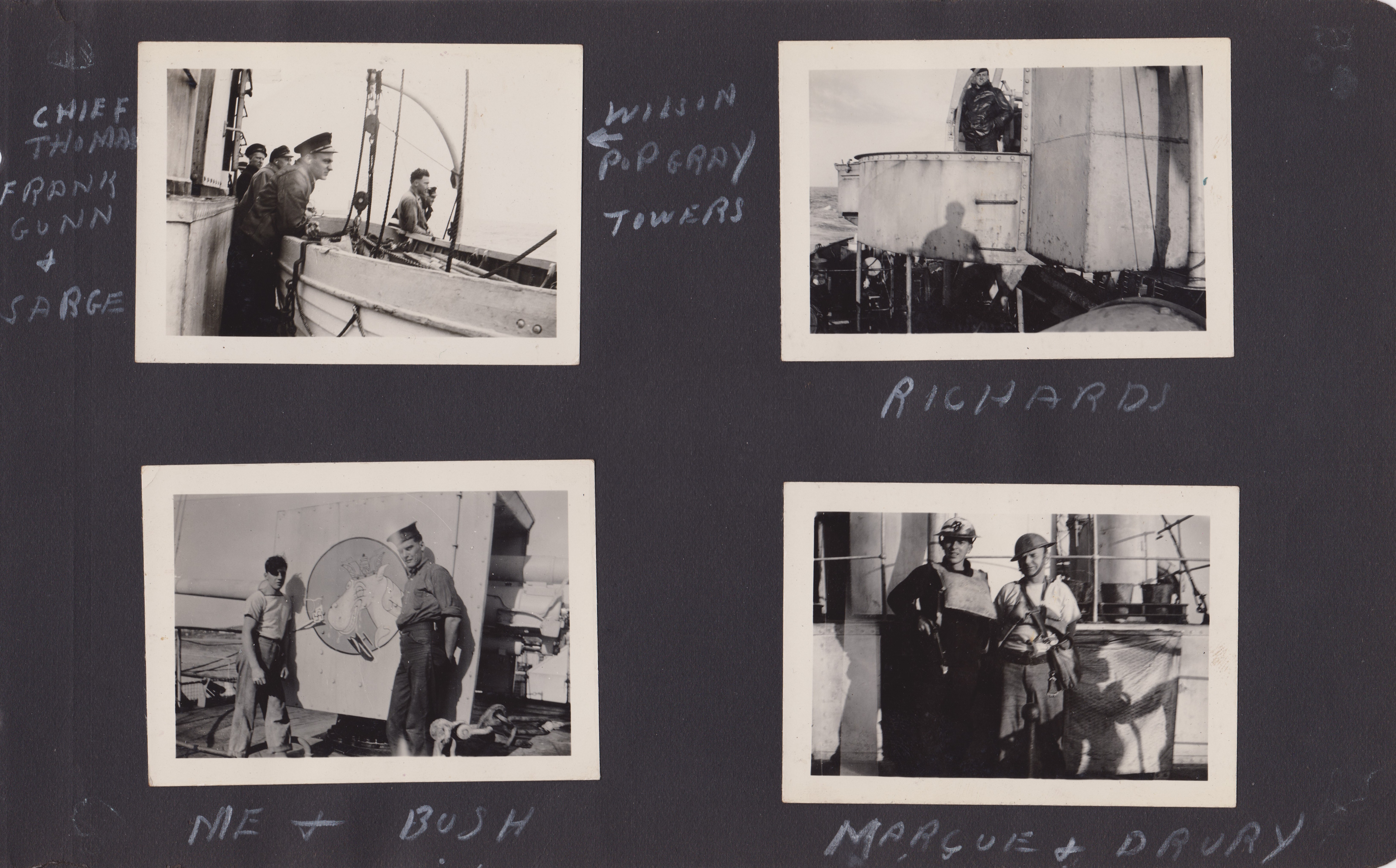 (RJG022) Album page 3 - HMCS SOREL K153 (RJG023) (left) Chief Thomas, Frank Gunn and Sarge (right) Wilson, Pop Gray, Towers by the ship's boat on HMCS SOREL K153 (RJG024) Jack Gilbrook and Bush by the gunshield art on HMCS SOREL K153 (RJG025) Richard's in the after gun tub on HMCS SOREL K153 (RJG026) Marcue and Drury onboard HMCS SOREL K153
