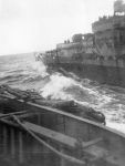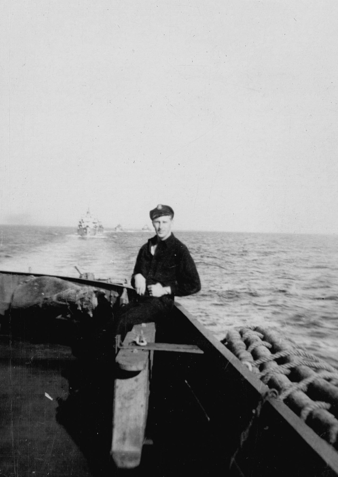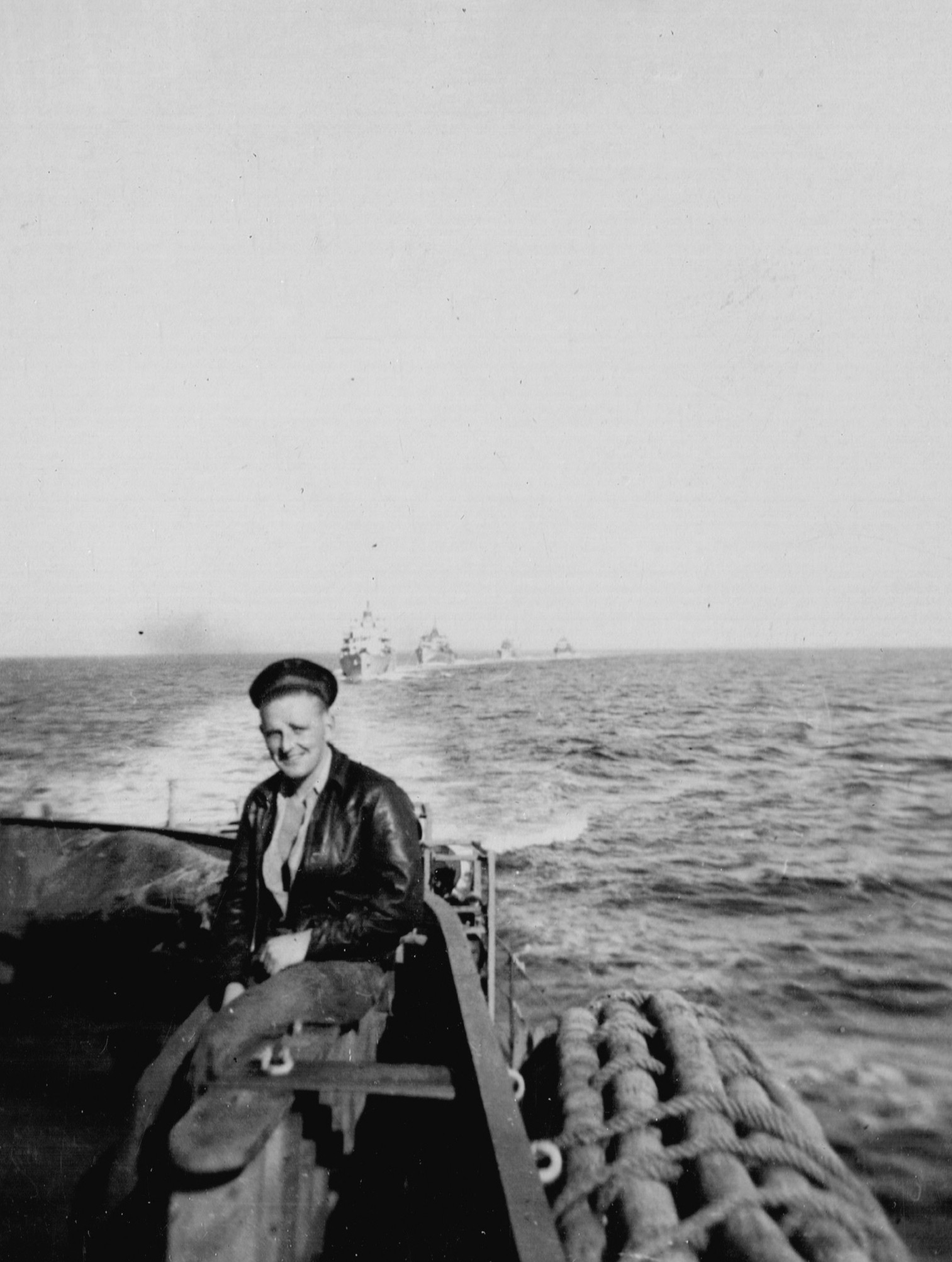 (RSR081) Escort group following in line astern of HMCS MEON. Photo taken from the port side of MEON'S after gun deck (RSR082 - RSR084) Unidentified sailors on the port side of the after gun deck on HMCS MEON (RSR085) Quarterdeck of HMCS MEON - note the rough seas in the back ground