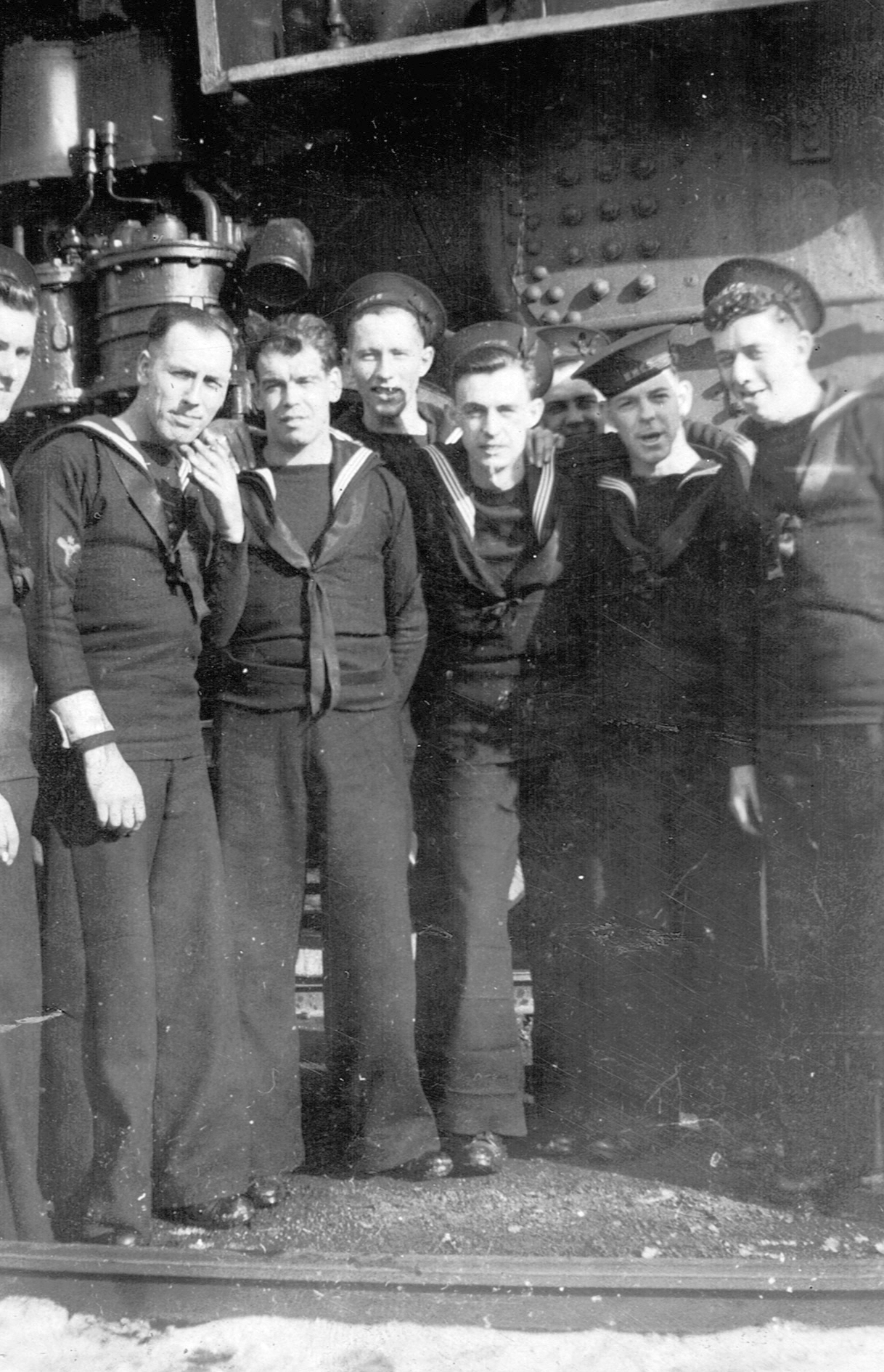 (RSR013) Unidentified sailor with ships nested in the background. HMCS BATTLEFORD K165 alongside the jetty; HMCS DUNDAS K229 centre; outboard ship unknown. Possibly HMC Dockyard Halifax (RSR014 - RSR015) Unidentified sailors doing what appears to be shoveling coal in the window of the building behind them. It is believed the photo is taken at HMCS STADACONA or one of surrounding units such as HMCS PEREGRINE or in HMC Dockyard.