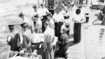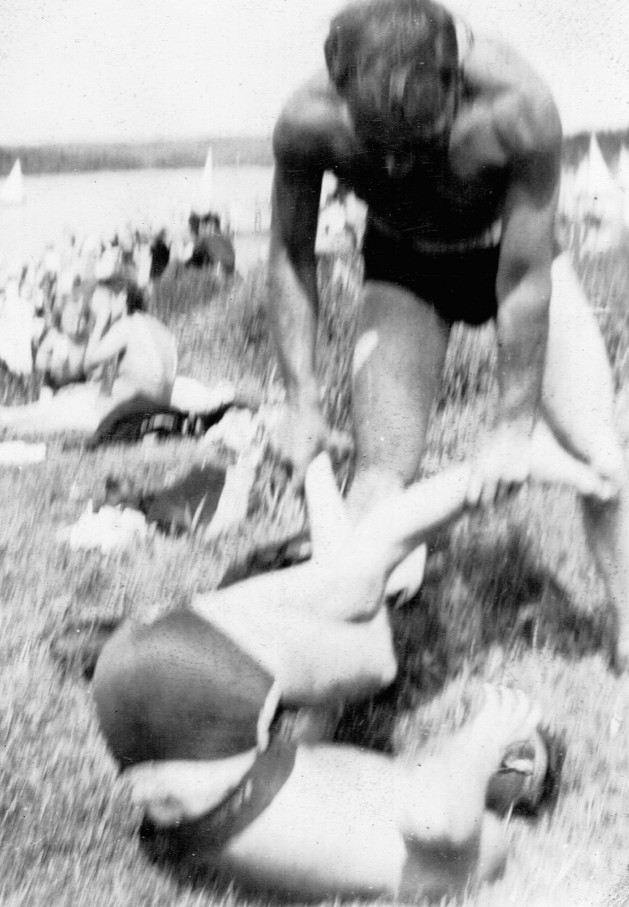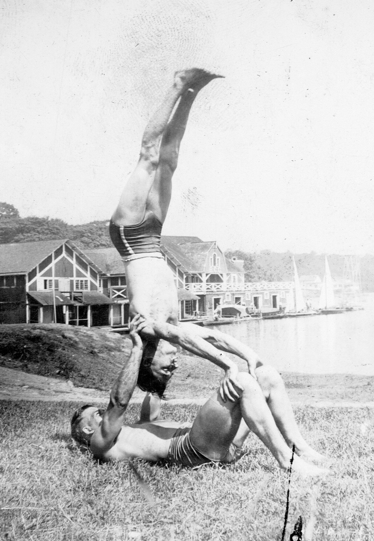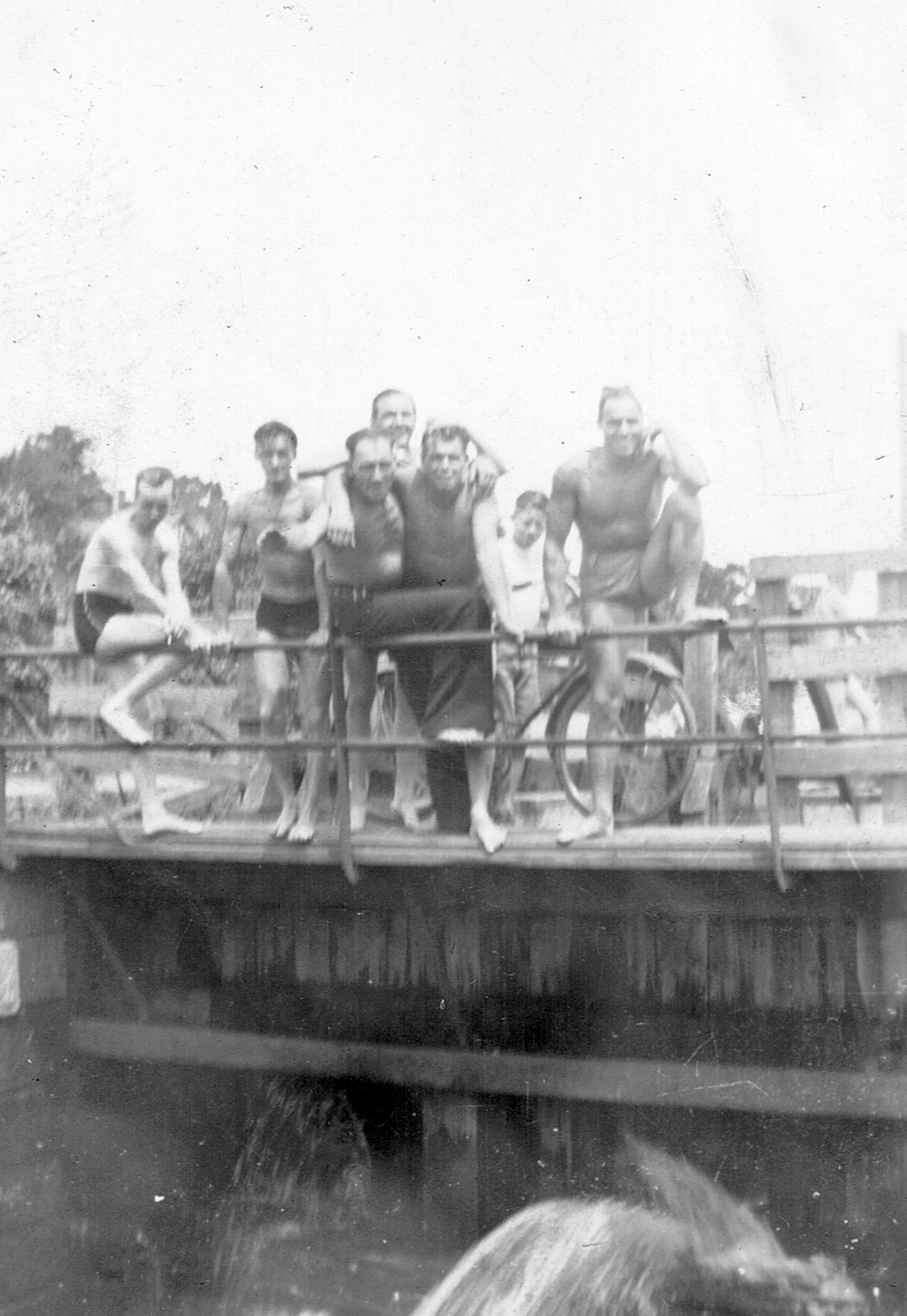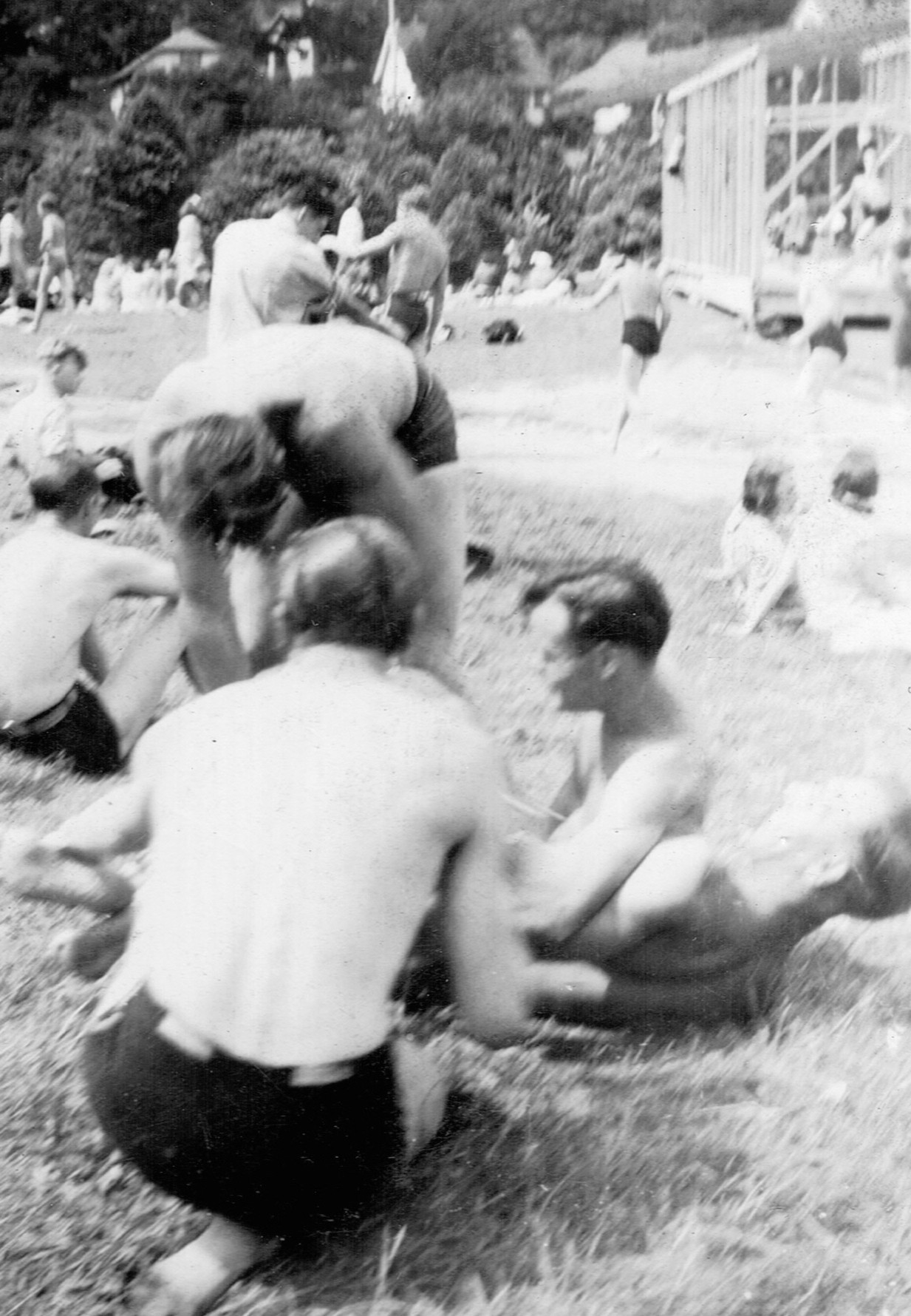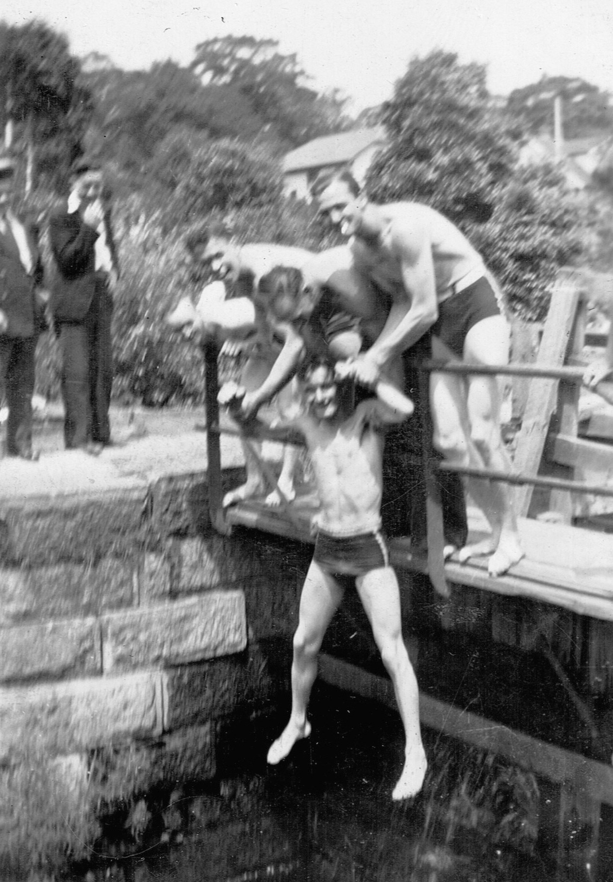 (RSR053 - RSR054) Unidentified sailors swimming at Lake Banook, Nova Scotia and (RSR055) taking part in antics on the lock at the entrance to the Shubenacadie Canal on Lake Banook