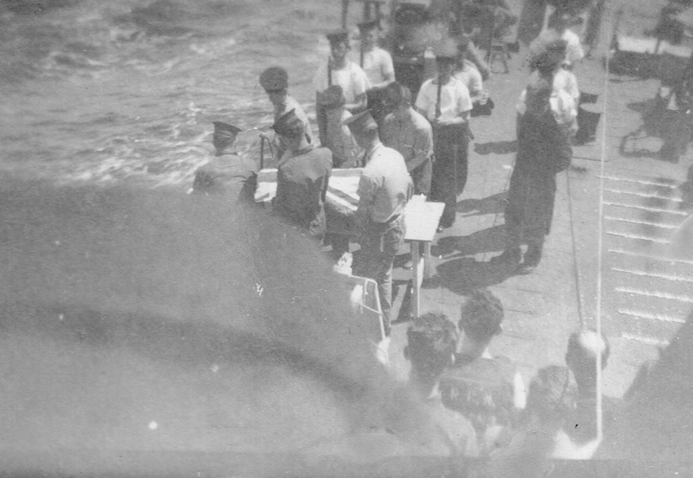 (RSR090) Four unidentified sailors by the gun on the aft gun deck on HMCS MEON (RSR091 - RSR092) Large group of unidentified sailors on the aft gun deck on HMCS MEON. Both photos are of the same group, taken a few seconds apart.