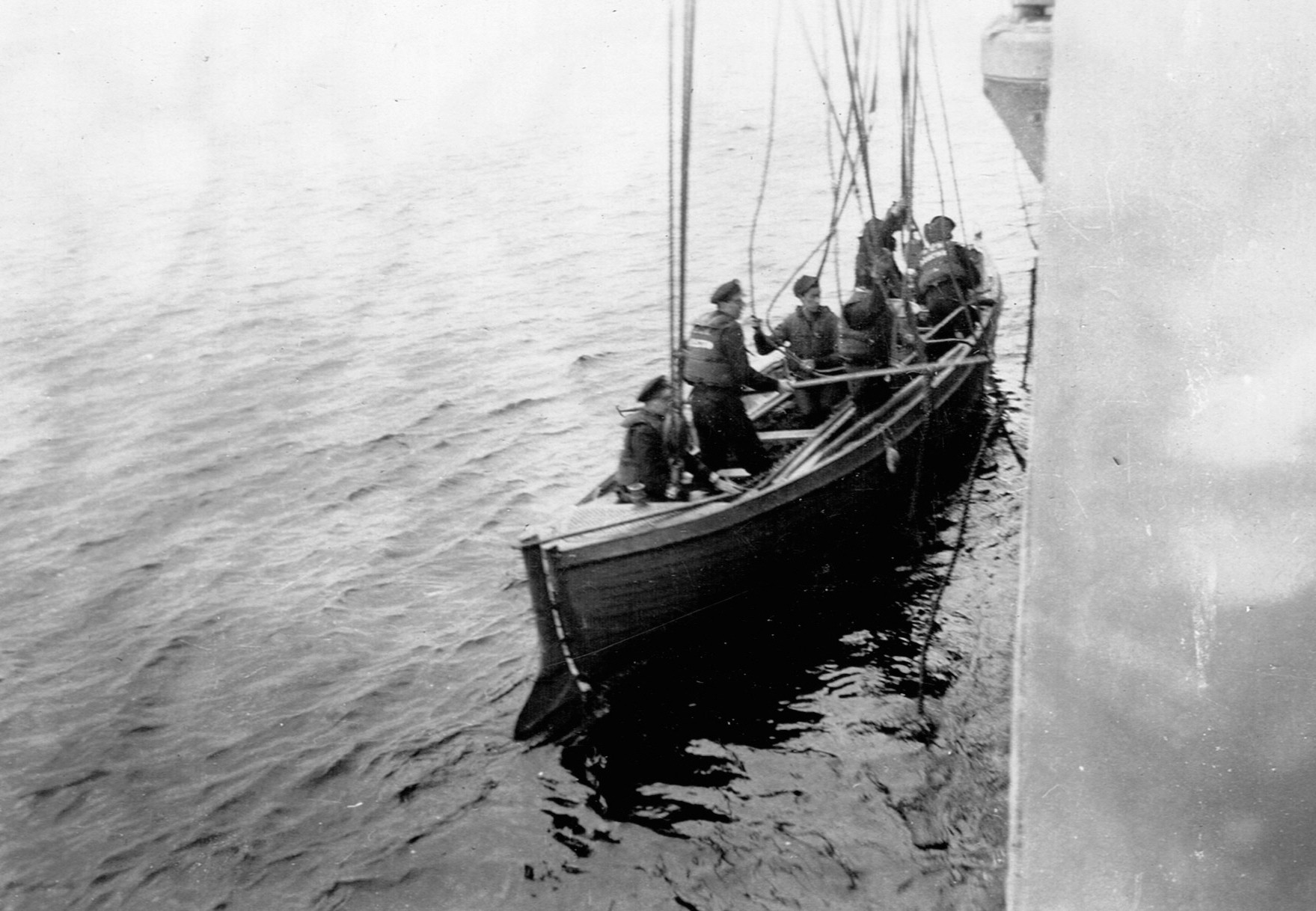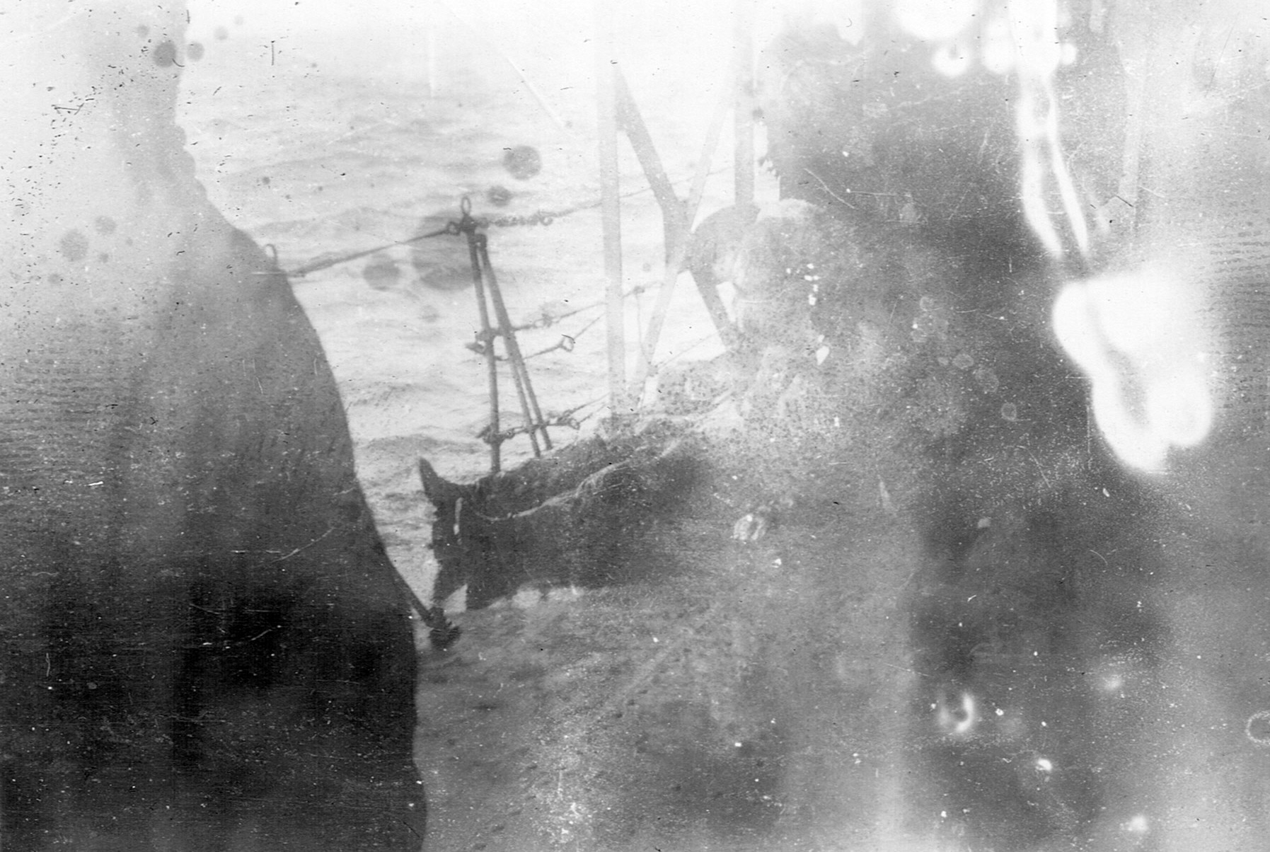 These 3 photos seem to show the recovery of the 2 bodies at sea by HMCS MEON (RSR109) The life vest on the casualty in this first photo appears to be a Luftwaffe Kapok life vest. (RSR110) This photo shows the recovery of a body grappling hook and Shepard's hook. The life vest is different from the one in photo RSR109. (RSR110) This photo shows what appears to be a casualty on the deck of HMCS MEON.