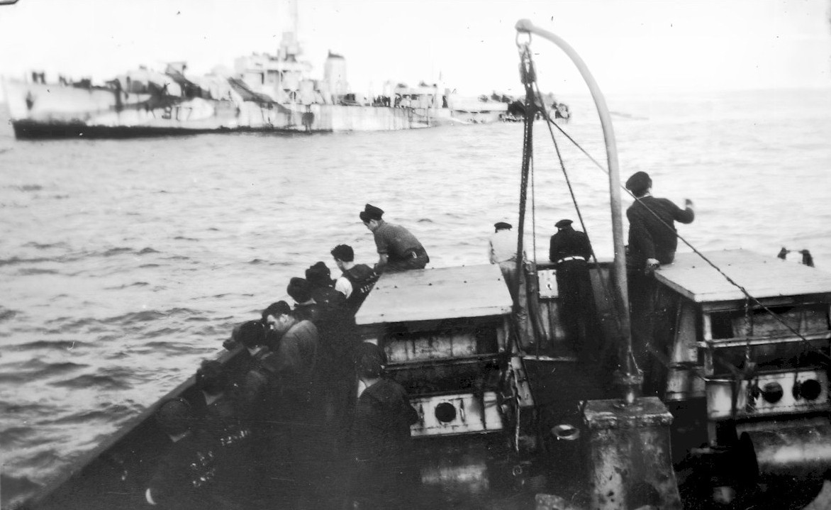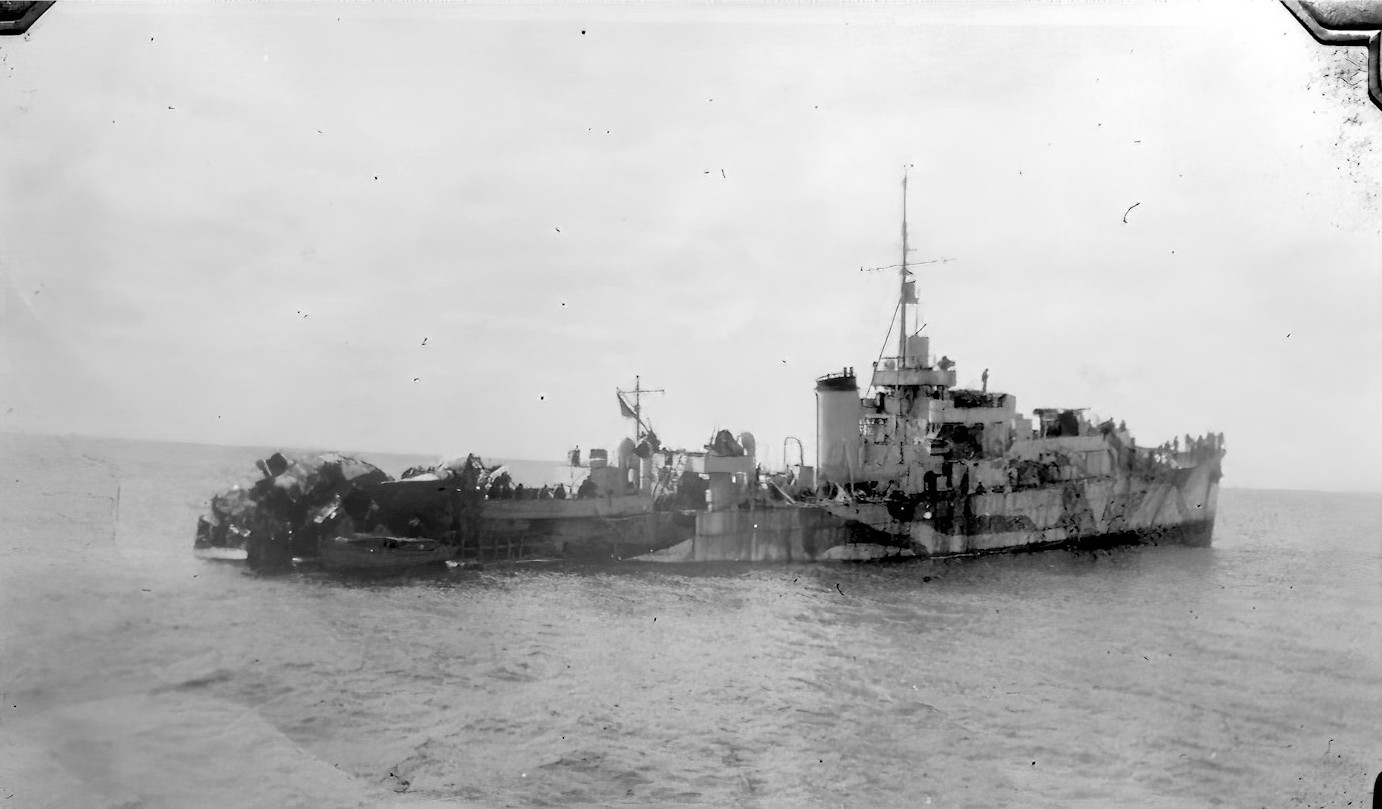 (CJR002) HMCS CHEBOGUE K317 after being torpedoed by U-1227 on 04 Oct 1944 (CJR003) HMCS CHAMBLY K116 prepares to tow HMCS CHEBOGUE K317 (CJR004) HMCS CHAMBLY K116 (foreground) with slack tow line visible been her and HMCS CHEBOGUE K317