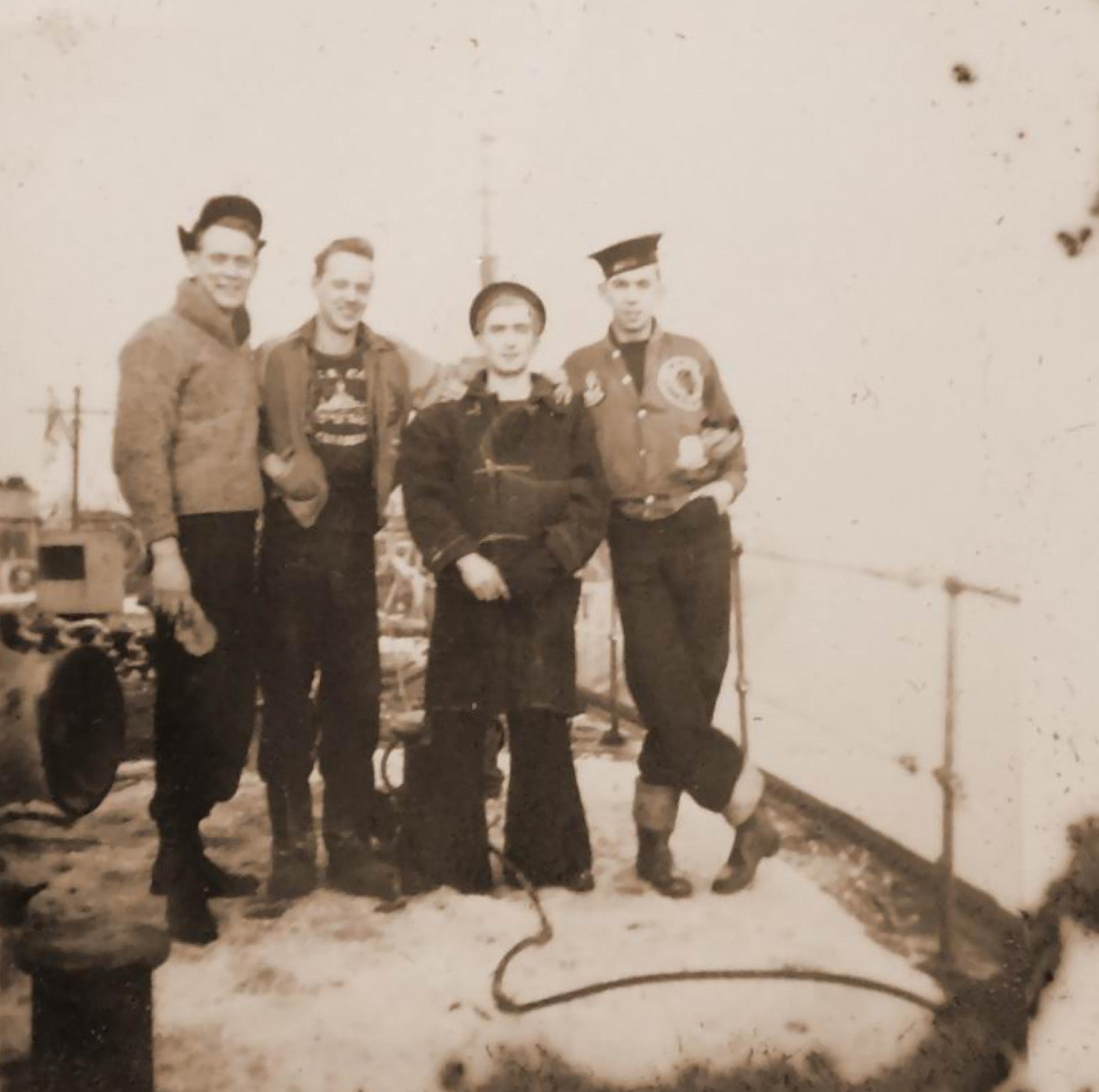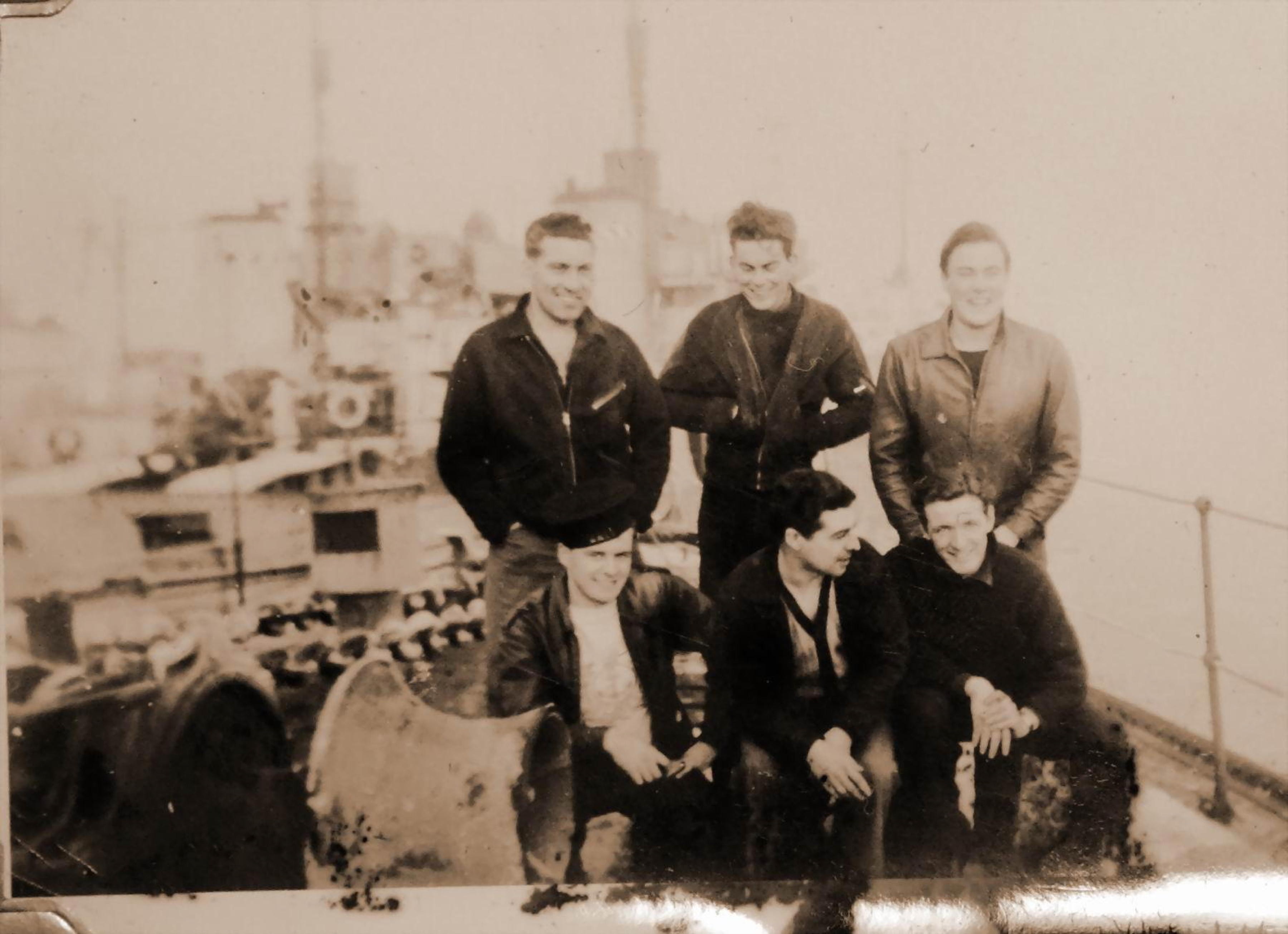 (CJR010-CJR012) Shipmates of Clarence Reid on the fo'c's'le of HMCS CHAMBLY K116 (CJR013-CRJ014) Shipmates on the fo'c's'le of HMCS CHAMBLY - Clarence Reid standing 3rd from right holding a pipe