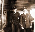 (CRJ015) A special occasion in the mess deck on HMCS CHAMBLY K116 (CRJ016 - CRJ017) Unknown rating on HMCS CHAMBLY K116 standing before an officer and what appears to be 2 Petty Officers. Webmaster's note: It is believed that this is the CO as a 2 badge AB and he has changed places with the youngest sailor on ship for Christmas Day. The crew in the background seems to be having way too much fun for this to be a normal occasion for the sailor to be standing in front of a ship's officers for either request men or defaulters. (CRJ018) Unknown "officer" on the bridge of HMCS CHAMBLY K116. Webmaster's note: it is believed that this photo is part of the the 3 preceding photos as the officer's uniform is ill fitting and possibly is a rating who exchanged places with another ship's officer or is perhaps the youngest sailor who changed places the Commanding Officer on Christmas Day.