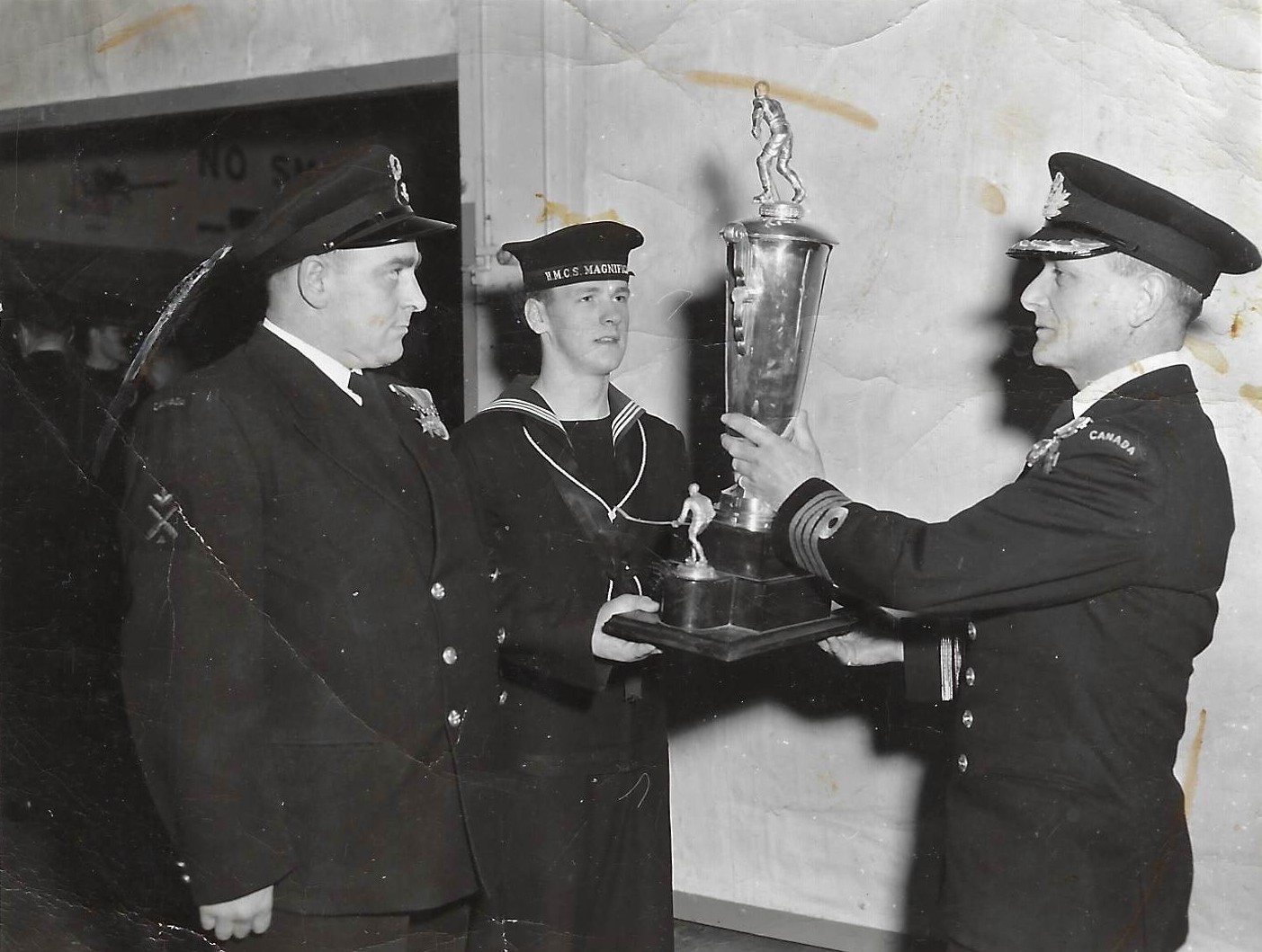 (MDP001) Malcolm Payne, CPO2, RCN, ret'd (MDP002) Record of Drafts from the Certificates of Service for Malcolm Payne (MDP003) HMCS MAGNIFICENT at Halifax (MDP004) Fleet Hockey Trophy being awarded to a team member from HMCS MAGNIFICENT. PO1 Malcolm Payne on the left (MDP005) Gunnery Training on HMCS IROQUOIS