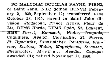 PAYNE, Malcolm Douglas (Mac) (Wacker) - of Moncton, NB passed away on April 16, 1997 at Moncton Hospital at the age of 75. Malcolm was born on 18 December, 1921, in St. John, New Brunswick. He was the son of the late Joseph Albert and Myrtha Blanche (MacFarlane) Payne. Malcolm was a proud member of the RCNVR/RCN/RCNR joining in Feb. 1939 and was S.O.S. 20 Dec 1972 . Malcolm sailed on a lot of Canada's ships during his career; Carriers, Destroyers, Minesweepers and Gateboats. Malcolm was Manager for the Shearwater Flyers during their 1956 Championship season. Malcolm is survived by his daughter Carolyn (John) LeBlanc,son James (Judy) and son Ronald (Diane), as well as numerous grand and great grandchildren. Mac was predeceased by his wife, Lillian C. (Tomes) Payne (1984) and now rest together at St. John's Cemetery, Halifax Nova Scotia.
