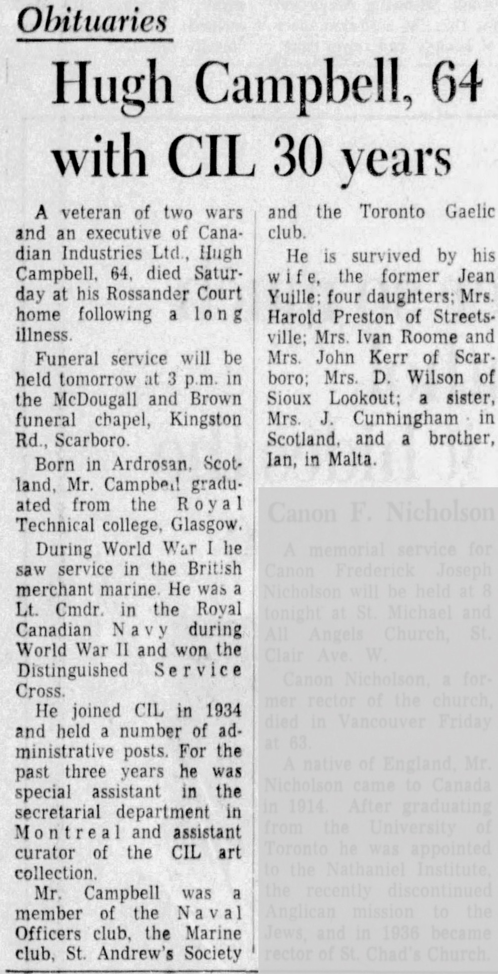 CAMPBELL, Hugh - 64 with CIL 30 years. A veteran of two wars and an executive of Canadian Industries Ltd, Hugh Campbell, 64, died Saturday at his Rossander Court home following a long illness.