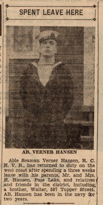 HANSEN, Verner (Vern) - is survived by his beloved wife of 58 years, Helen (Cattani). He is also survived by his loving daughters and their husbands, Diane and Joe Piechota, Catherine and Al Dyson, Laura and Richard Danelisky, and Verna and Glenn Brannan. Vern was admired and will be missed by his 5 grandchildren Cindie and Michael Hietanen, Stephenie and Allison Danelisky, Andrew Piechota, and his step-granddaughter Lindsay Dyson. Vern is also survived by his sisters-in-law Teresa Stortini, Margaret Cattani, Rita Cattani, and Toni Cattani. He is fondly remembered by numerous nieces and nephews. Vern was predeceased by his parents Anne and Hans (Harry) Hansen and his brothers and sisters Telef Hansen, Walter Hansen, Richard (Dick) Hansen, Emma Hamlin, and Laura Jones. Vern was born in Sellers Township, Ontario. He was raised in Lybster Township and moved to Pass Lake, Ontario when he was a young man. He proudly served in the Canadian Navy in WW II. Upon his discharge from the Navy, he began his lifelong commitment to civil service by working for the Ministry of Natural Resources. Memorable moments in his career included working on the construction of the Sibley Road into the Provincial Park, where he also served as the Park's first Park Ranger. His 37-year career fulfilled his passion for the outdoors. Later in his career, he coordinated the Junior Ranger Program, which he found enjoyable and rewarding work. Vern retired from the Ministry in May of 1983. His retirement included cherished family time, traveling with his wife Helen, golfing with friends and family, photography and creating beautiful pieces of furniture for the family. (The Thunder Bay Chronicle Journal)