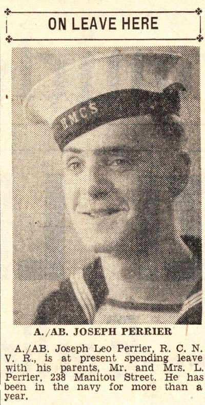 PERRIER, Leon Joseph - age 82 years of Atikokan, passed away peacefully with family at his side, at the Atikokan General Hospital on November 24th, 2008. Leon was born in Port Arthur on July 28th, 1926 to Loretta and Leo Perrier. At the age of 19 he joined the Royal Canadian Navy and served until 1946. After returning home he moved to Atikokan to work at Steep Rock Iron Mines, working his way up from Shovel Operator to Open Pit Mine Superintendent, until it's closing. With all his knowledge and experience in mining, Detour Lake then hired Leon as a Mine Manager, where he stayed until his retirement. Not one to sit back and relax, Leon then worked as Manager of the Atikokan Municipal Airport, until full retirement, where even though he could no longer use his pilot's licence due to health issues, he could still indulge in his passion for planes and flying. Leon loved sharing time with family and friends in outdoor activities such as camping, fishing, hunting trips with "the boys", the family cabin at Calm Lake and carpentry. Leon was united in marriage to his wife of 61 years, Heidi (Hilda) Harrison of Winnipeg in 1947 in Atikokan, where they made their lives raising a family of 4. Leon was a member of St. Patrick's parish and former member of the Knights of Columbus. Leon is survived by his loving wife Heidi, children Wayne (Mellanie) of Quesnell, B.C. , Terry (Wendy) of Shabaqua, Debi (Paul) Rasinaho of Factor Lake (Atikokan) and Marianne Perrier of Atikokan; grandchildren Brooke Rasinaho of Thunder Bay, Nicole Perrier of Kelowna, B.C. , and Bo Steward of Thunder Bay; brothers Ron (Rikka) Perrier of Thunder Bay, Bob, Bruce and sister Georgina (Tony) Gash of Thunder Bay as well as numerous nieces, nephews, cousins and special family friends Helen & Gary Cook & family - Charles (Lisa) Cook, Carol (Tyler) Coulson and children. He was predeceased by his parents Loretta and Leo; brothers Peter and Don; sisters Margie, June, Bernadette, Dorothy and twin daughters at birth. Cremation has taken place. A memorial service for family and friends will be held at 2:00 p.m. on Friday, November 28th at St. Patrick's Church in Atikokan with Father Tito officiating. A private family interment will be held Monday, December 1st in Sunset Memorial Gardens, Thunder Bay at 1:00 p.m. If friends so desire, in lieu of flowers, donations to the Atikokan General Hospital would be appreciated. Irish prayer: Until we meet again, may God hold you in the palm of His hand. (The Thunder Bay Chonicle Journal 26 Nov 2008)