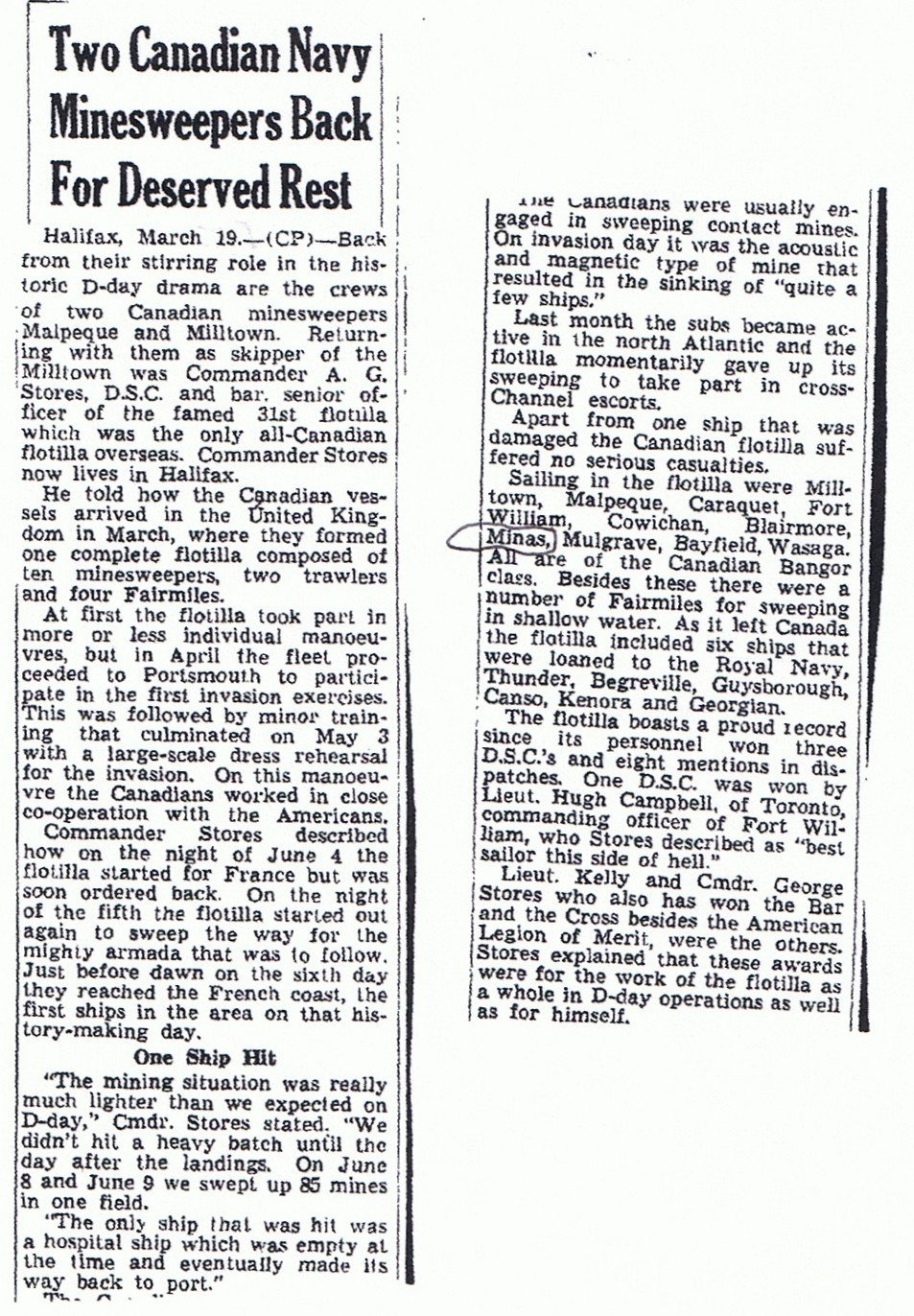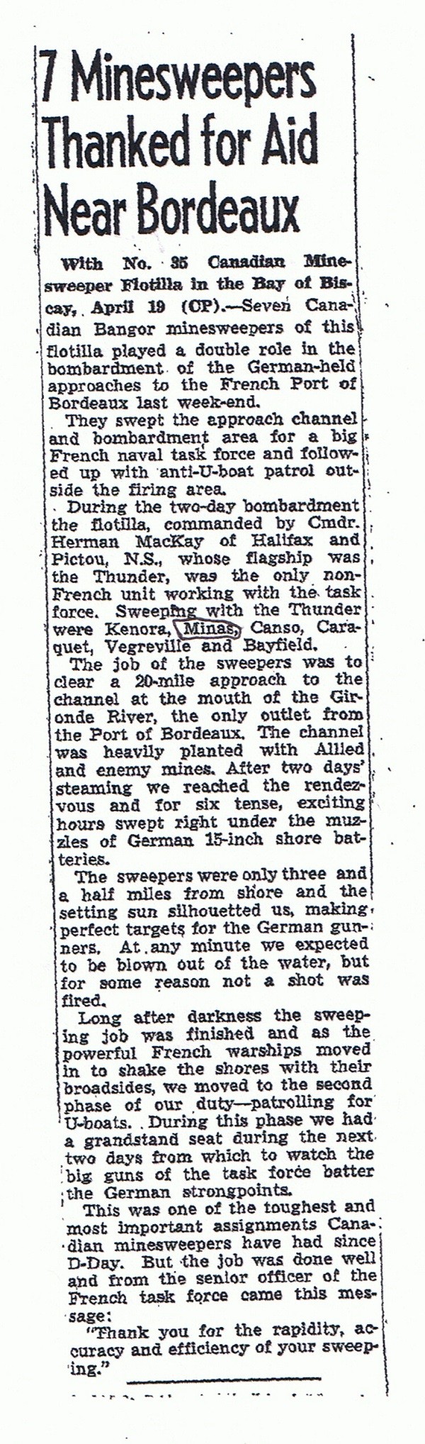 (BGRG001) 7 Minesweepers Thanked For Aid Near Bordeaux // Globe and Mail 20 Apr 1945 // Courtesy of Mary Kienapple (BGRG002) Two Canadian Minesweepers Back For Deserved Rest // Hamilton Spectator 19 Mar 1945 // Courtesy of Mary Kienapple (BGRG003) Canadian Navy Men Praised For Role In Huge Onslaught // Hamilton Spectator 14 Jun 1944 // Courtesy of Mary Kienapple (BGRG004) Kept Safe by Canadian Corvettes // Globe and Mail 18 Oct 1944 // Courtesy of Mary Kienapple (BGRG005) Unknown Bangor Class minesweeper with HNLMS N15 alongside // From the collection of John & Martin Nickels // Courtesy of Steve Hlasny // HNLMS N15 (formerly O15, then later P15) served out of Halifax for anti-submarine training until relived by HMS/M P553 in Aug 1942.