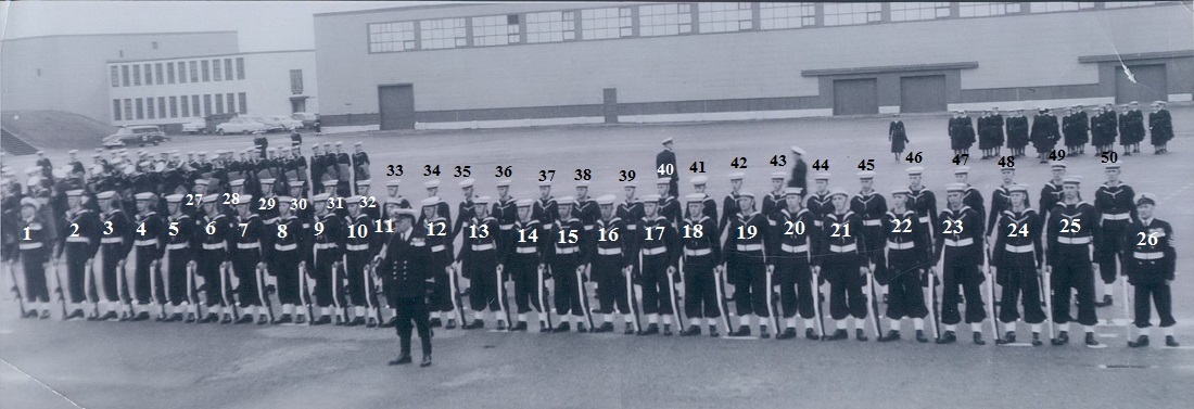 (1) Wilwand, Bob (2) Wilson, Wayne (3) Cormier (4) Douglass, Richard (5) Spencer (6) Smail (Butch) (7) Bing, Mr. (8) Freeman, CPO2 (9) Pollock (11) Andrews, Monty (12) Langille, Bob (13) Hazell, Doug (14) Birchall (16) Fisher, Douglas (from Pictou, NS) (18) Mabb, Larry (21) Drysdale (23) Schultz, Roy (24) Melanson (25) Beatty, Frank (26) Abday (29) Bradshaw (30) Took (32) Moore (34) Coutts (38) Hutchinson, Bob (39) Carson, Dennis (40) Tay, Carl (42) Patterson, Jack (45) Downie (48) Keizer, Fred (50) Cuthberson (52) Felix (56) Taylor, Gerald (Gerry) (58) Allison, John (59) Petter (60) Cuthbert