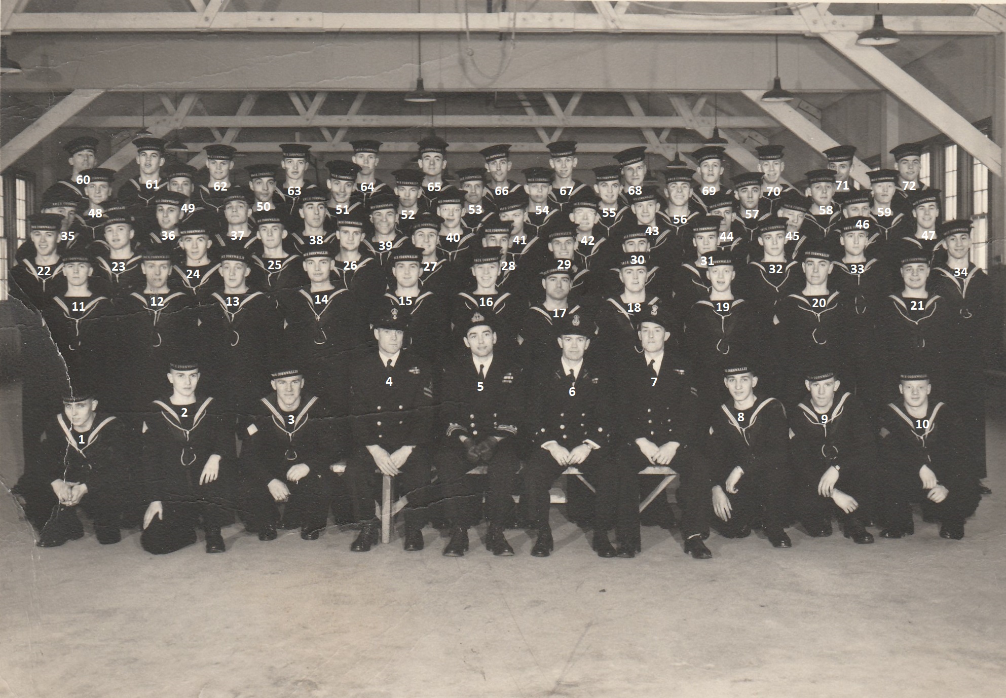 (3) Kullman, Morley, CS (23) Ashworth, Arnold, CS (24) Takoff, Graham, CS (25) Switzer, Albert, CS (26) Whalley, Terry, CS (45) Johnston, Paul,CS (50) Atkins, Charles (Chuck), CS (51) Hillaby, Bill, CS * CS - Communications Special. The CS rates were all drafted to HMCS GLOUCESTER for trades training after CORNWALLIS.