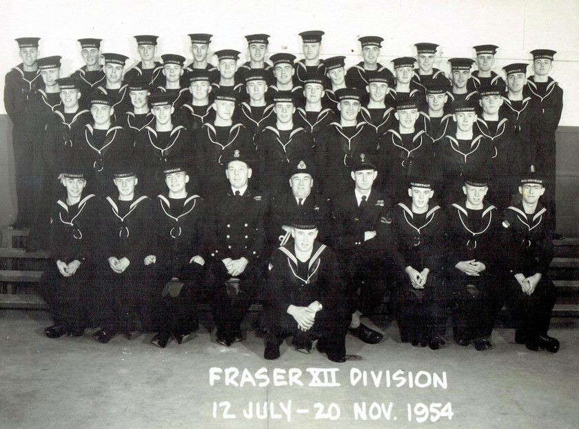 Fraser XII Division 12 Jul 1954 - 20 Nov 1954 Click here to view the photo with Staff and Recruits numbered for identification PO Ken Graham - front row, 4th from right From the collection of Ken Graham Courtesy of Robert Graham