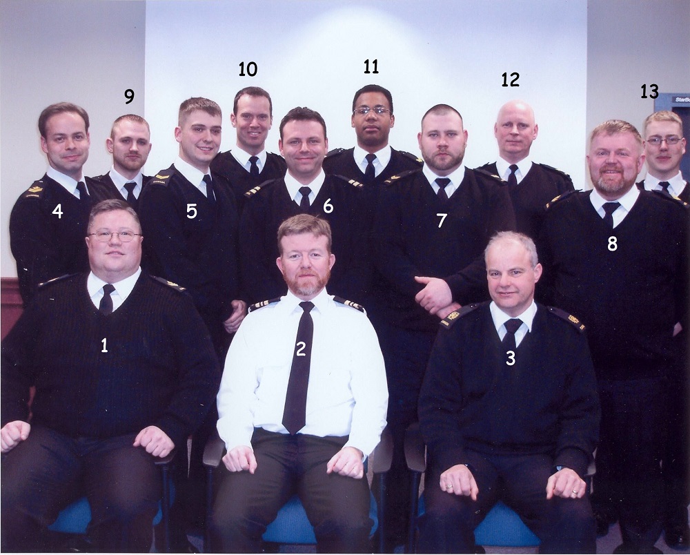 (1) Forrest, Vernon, MS (Inst) (2) Mangin, Mike, LCdr (Course Officer) (3) Upson, Dan, CPO2 (Inst) (4) Beaupre, Patrick, MS (5) Carter, Duncan, LS (6) Darsigny, Raphael, LT (7) Garbella, Darrell, LS (8) MacDonald, James L, LS (9) Upcott, Robert, LS (10) MacIntyre, Blais, LS (11) Evans, Yevrag, LS (12) Dowie, Brian, LS (13) Fudge, Rick, LS