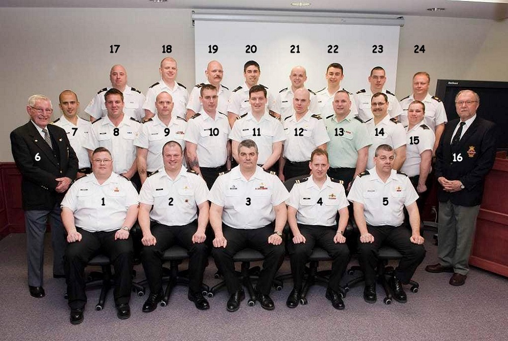 (1) Forrest, Vernon, MS, Inst. (2) Sabourin, J.R., MS, Inst. (3) Bryan, Peter, LCdr, Course Officer (4) Unknown, LT (5) Kidd, John, PO1, Inst. (6) Brown, Donald, SAOC Rep. (7) Larrivee, Phillipe, Lt (8) Hamilton, Michael (9) Davenport, Chris, MS (10) Unknown (11) Mathiesen, Poul, Lt (12) Barker, Robert (13) Robinson, Chris B., WO (14) Langley, Eli, LS (15) Morrison, Justin, OS (16) Chatham, Terry, SAOC Rep. (17) Colbourne, Russell, LS (18) Puxty, Daniel, MS (19) Unknown (20) Read, Darrell, LS (21) Unknown (22) Keeling, Matthew, Lt (23) Lallemand, Francis, MS (24) Unknown