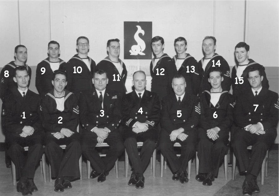 (1) Simpson, F. (2) Royale, G. (3) Hawkins, J., CPO1 (Instructor) (4) Elson, Lt, (Sub School CO) (5) Howell, PO1 (Instructor) (6) Whelan, A. (7) Murray, D. (8) Decker, C. (9) Lake, R. (10) Russelo, Carl (11) McEachern, B. (12) Findlay, C. (13) Richards, D. (14) Segal (15) Smith, P.