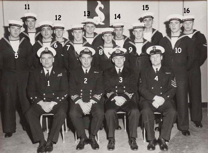 (1) Hawkins, J., CPO1 (Instructor) (2) Meek, LCdr, (3) Perks, R., Lt (Sub School CO) (4) Black, W., PO1, (Instructor) (5) Holbrow, W. (6) Cimello, G. (7) Presley, W. (8) Melanson, D. (9) MacDougall, J. (10) McCluskey, R. (11) Anderson, D. (12) Cameron, D. (13) Hermann, C. (14) Rice, H. (15) Conway, J. (16) Dyck, L.