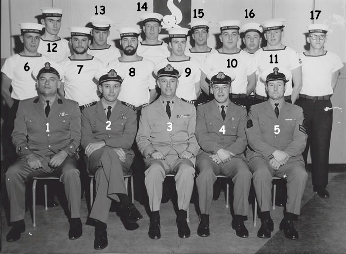 (1) Hawkins Justice, CPO1 (Instructor) (2) Gigg, Ed., Cdr (Submarine Squadron CO) (3) Cutts, J.M., Capt. (Guest) (4) Perks, Ron, Lt, (Sub School CO) (5) Black, William, PO1 (Instructor) (6) Boon, A. (7) Wilson, R. (8) Estabrooks, Keith (9) Brayshaw, Ray (10) Poirier, Gilles (11) Aubrey, Brett (12) Yeo, Tom (13) Cameron, S. (14) Pepper, Norm (15) Meilleau, J. (16) Rodden, Pat (17) Roman, W.