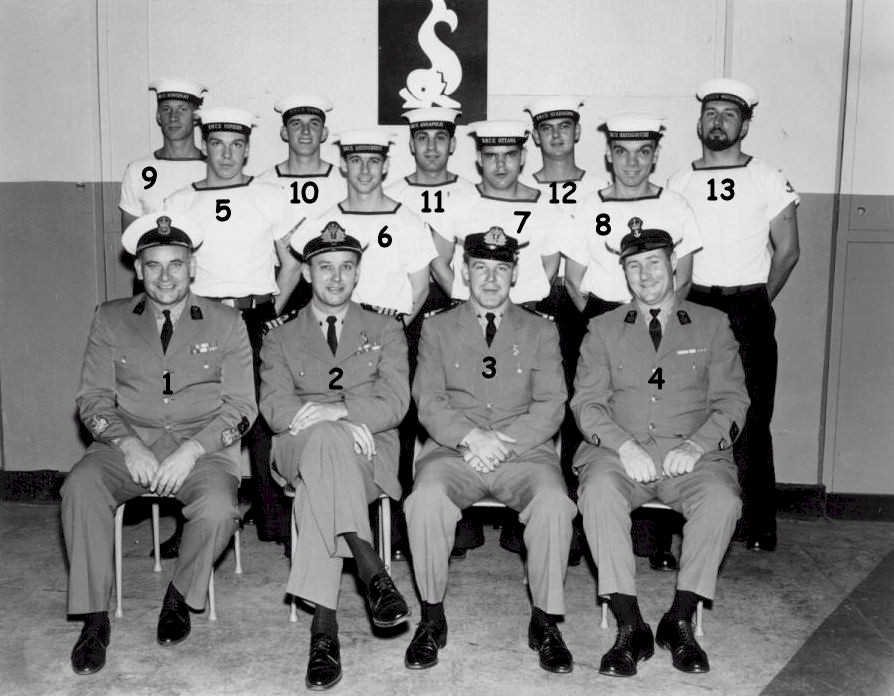 (1) Hawkins, J., CPO1, (Instructor) (2) Gigg, E., Cdr (Submarine Squadron CO) (3) Perks, R., Lt (Sub School CO) (4) Black, W., PO1 (Instructor) (5) Fairfax, D. (6) O'Hara, T. (7) Hills (8) Hanna, W. (9) Brokenshire, J.W. (10) Roach, G. (11) Ciracco, P. (12) Francis (13) Hunter, G.