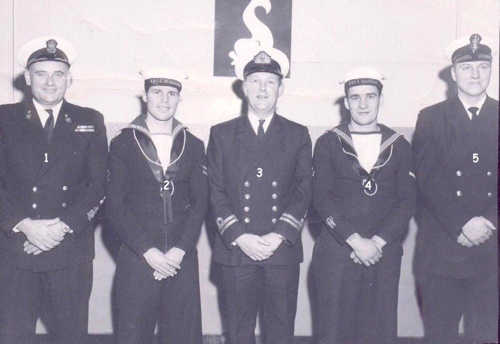 (1) Hawkins, J., CPO1 (Instructor) (2) Broyden, W. (3) Cairns, P., Lt (Submarine School CO) (4) Courcy, D. (5) Newman, R., PO1 (Instructor)