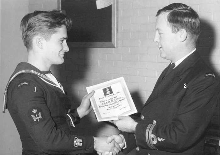 (2) Lt. P. Cairns (Sub School CO) congratulating (1) D. Courcy