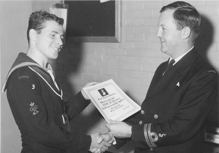(4) Lt. P., Cairns (Sub School CO) congratulating (3) W. Broyden his course certificate