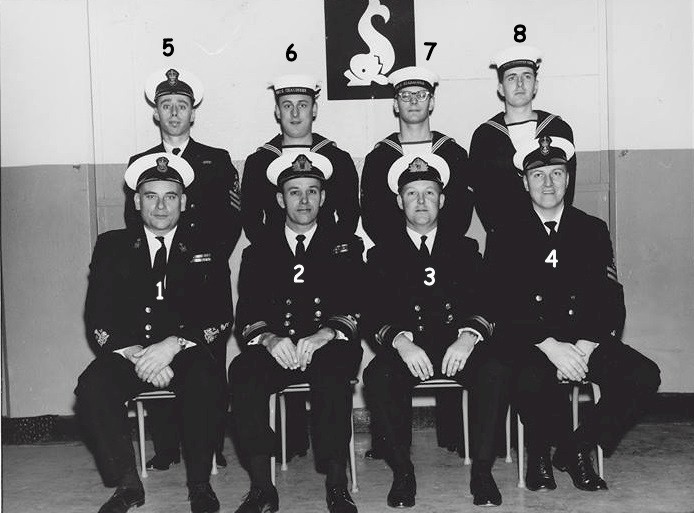 (1) Hawkins, J., CPO1 (Instructor) (2) Gigg, E., Cdr (Sub Squadron CO) (3) Cairns, P., Lt (Sub School CO) (4) Newman, R., PO1 (Instructor) (5) Hall, J., PO1 (6) Williamson, AB (7) Anderson, D., AB (8) Wambolt, H., AB