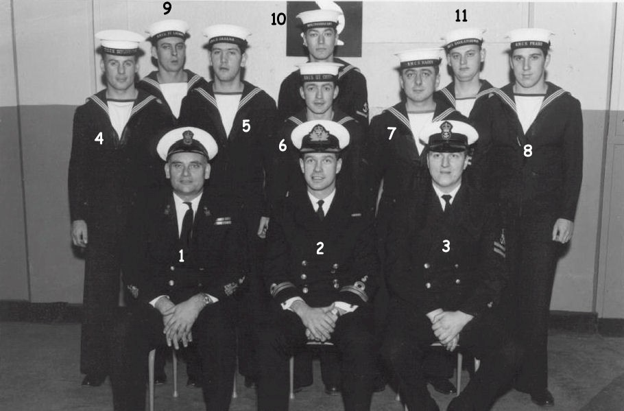 (1) Hawkins, J., CPO1 (Instructor) (2) Bell, J., Lt (Submarine School CO) (3) Newman, R., PO1 (Instructor) (4) Wood (5) Williams (6) Charleton, G. (7) Molloy, J. (8) Goodchild (9) Reynolds (10) Gillingham (11) Schatz, F.