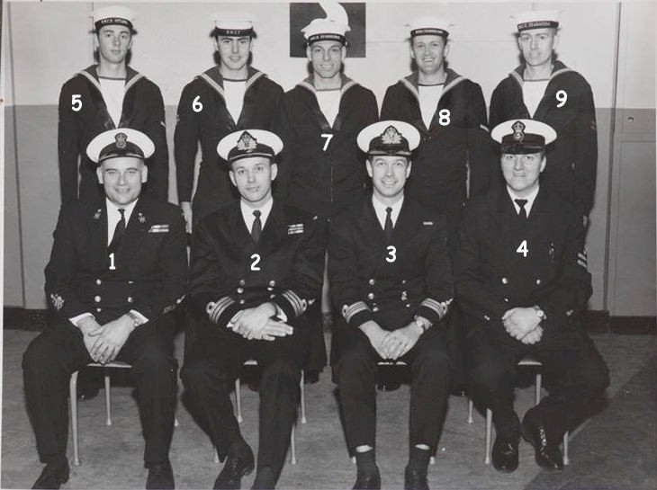 (1) Hawkins, J., CPO2 (Instructor) (2) Gigg, E., Cdr (Submarine Squadron CO) (3) Bell, J., LCdr (Submarine School CO) (4) Newman, R., PO1 (Instructor) (5) Poirier, W. (6) Jossee, B. (7) Pfaff, J. (8) McGuire, J. (9) South, J.