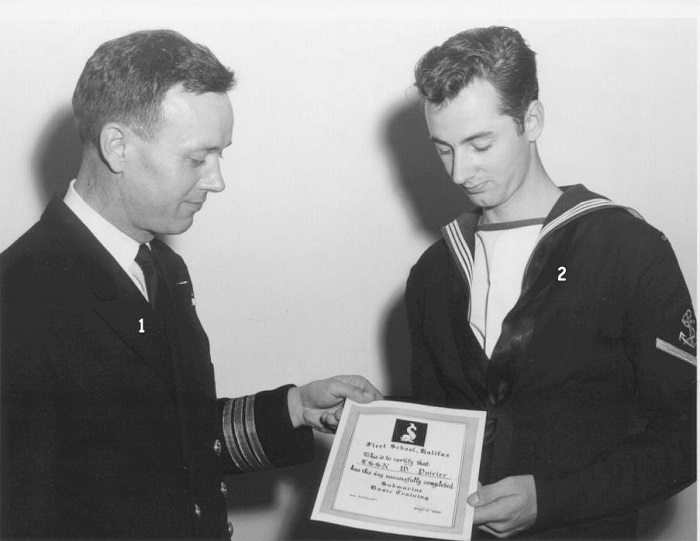 (1) Cdr E. Gigg (Sub Squadron CO) congratulating (2) LS W. Poirier