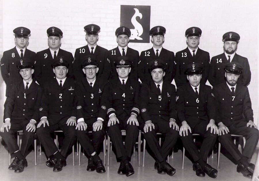 (1) Cronk, AB (2) Weatherup, Bud, PO1 ( Instructor) (3) Kramer, F., CPO2 (Instructor) (4) Falstrem, E., LCdr (Course Officer) (5) Hardy, D., CPO2 (Instructor) (6) Dean, D., LS (7) Davidson, R., AB (8) Pitcher, W., AB (9) Caldwell, D., LS (10) Rossell, K., AB (11) Smith, L., AB (12) VanRooyen, J., AB (13) Shields, J., AB (14) Proulx, J., AB