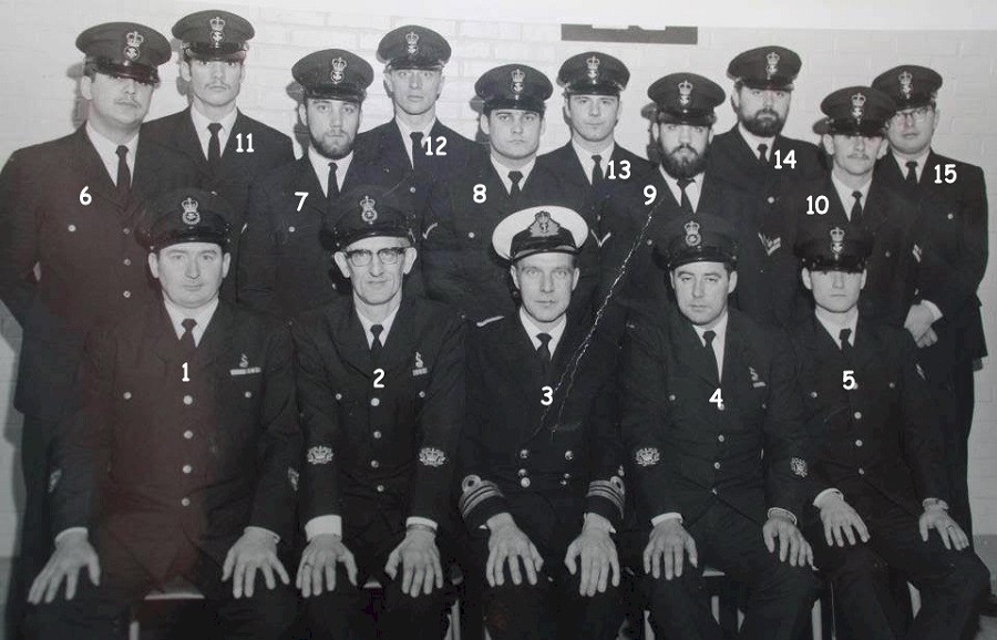 (1) Weatherup, Bud., CPO2 (Instructor) (2) Kramer, F., CPO2 (Instructor) (3) Young, C., LCdr (Course Officer) (4) Hardy, D., CPO2 (5) Hill, LS (6) Bouchard, AB (7) Biloski, M., AB (8) Fisher, R., AB (9) Damato, Frank, AB (10) Drouin, LS (11) Pallard, M., LS (12) Young, LS (13) Thompson, B., LS (14) Thompson, W., LS (15) Miniotas, AB