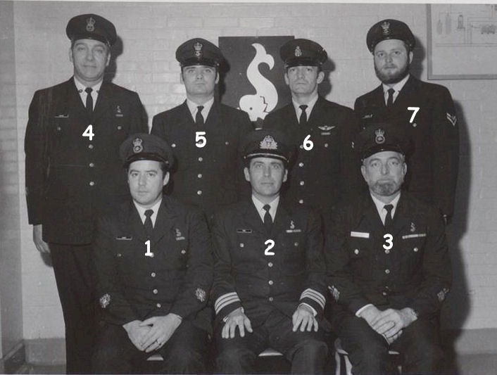(1) Hardy, D., CPO2 (Instructor) (2) Tate, M., Cdr, (Submarine Squadron CO (3) Chase, A., CPO1 (Instructor) (4) Ranger, L., CPO2 (Instructor) (5) Parrott, Brian (6) Dufault, J (7) Bienvenue, C.