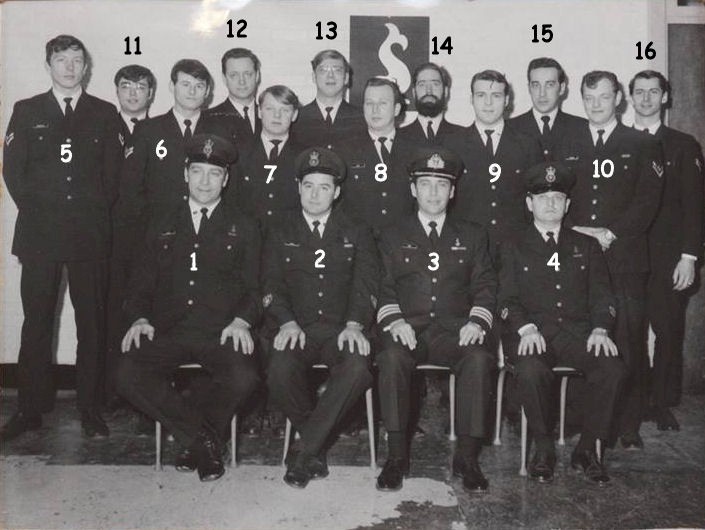 (1) Ranger, L., CPO2 (Instructor) (2) Hardy, D., CPO2 (Instructor) (3) Tate, M., Cdr (Submarine Squadron Commander) (4) Feener, J., PO1 (Instructor) (5) Mawdesley, T. (6) Rocheleau, L. (7) Beebe, W. (8) Vale, C. (9) Bell, Allan, ER (10) Haddow, A. (11) Paquette, S. (12) Prett, W. (13) Meleck, J. (14) Langley, J. (15) Burgoyne, J. (16) Osborne, E.