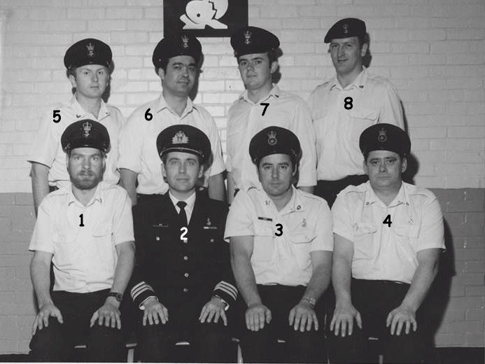 (1) Evans, R., PO1 (Instructor) (2) Tate, M., Cdr (Submarine Squadron Commander) (3) Hardy, D., CPO2 (Instructor) (4) MacDonald, C., PO1 (Instructor) (5) Firth, R. (6) Damzyck, R. (7) Middleton, R., (8) Allen, J.