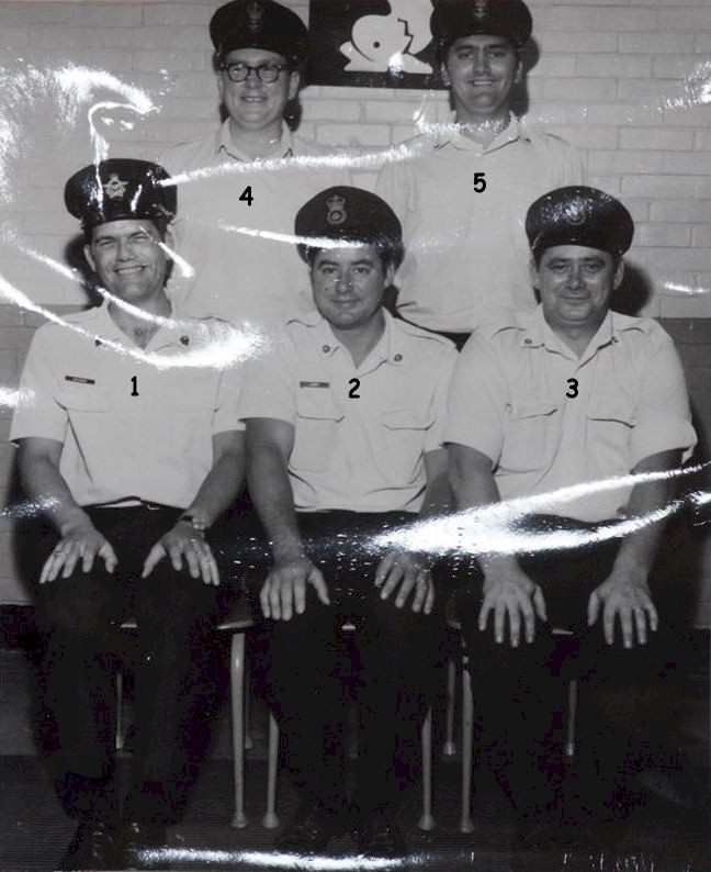 (1) Mossman, D., Sgt (Instructor) (3) Hardy, D., CPO2 (Instructor) (3) MacDonald, C., PO1 (4) Guttin, M. (5) Tatem, A.