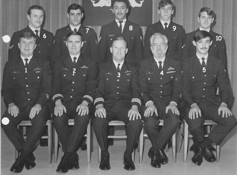 (1) Guilford, J., CPO2 (Instructor) (2) Sloan, W., Lt (Sub School CO) (3) Cairns, P., Cdr (Sub Squadron CO) (4) Chase, H., CPO1 (Instructor) (5) Barrett, R., OS (6) Yeman, D., OS (7) Foster, S., LS (8) Holloway, W., LS (9) Lewis, L., OS (10) Darch, G., AB