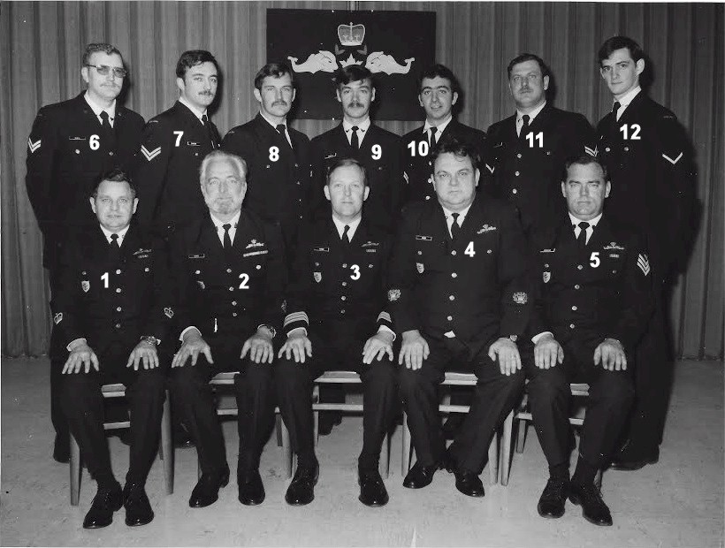 (1) Feener, J., PO1 (Instructor) (2) Chase, A., CPO1 (Instructor) (3) Cairns, P., Cdr (Sub Squadron CO) (4) Hinds, J., CPO2 (Instructor) (5) Bradshaw, W., PO2 (Instructor) (6) MacNeil, T., LS (7) Davidson, R., LSSN (8) Van Rooyen, J., LSET (9) Surette, J.J., LSRM (10) Murray, G., ABSN (11) Doyle, M., LSER (12) Northrup, J., ABRM