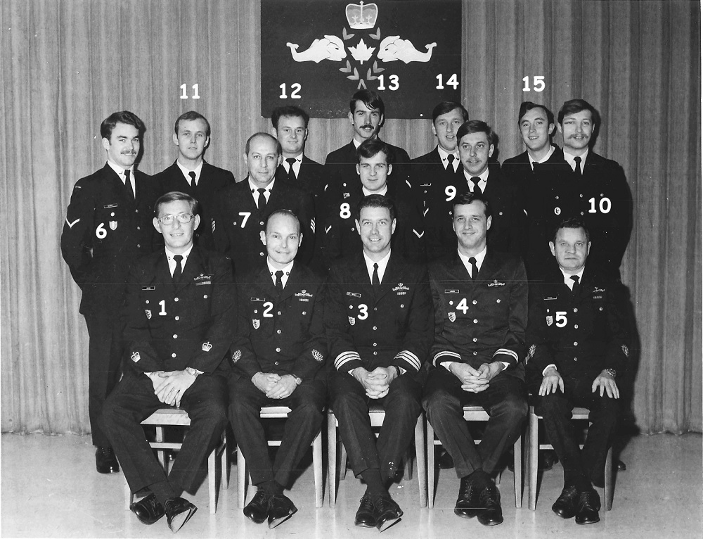 (1) Brown, Donald, PO1 (Instructor) (2) Park, Bob, CPO2 (Instructor) (3) Bell, Jim, Cdr (SM1) (4) Larsen, Sidney, LT (N) (Course Officer) (5) Feener, Jim CPO2 (Instructor) (6) Bagwell, Ian, ABER (7) Unknown (8) Unknown (9) Alarie, Pierre, ABWU (10) Pendergast, Jim, ABET (11) Napier, Kevin, ABWU (12) Hix, Ted, LSSN (13) Brackett, Mark, ABWU (14) Allison, John, LSSN (15) Haight, Ted, ABCK