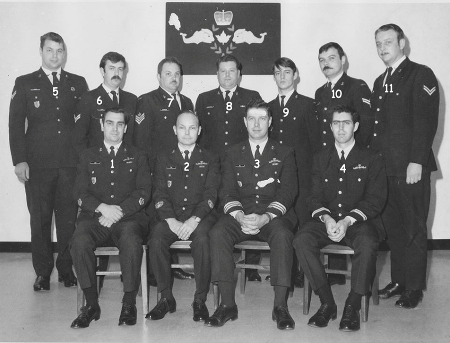 (1) Lake, R., PO1 (Instructor) (2) Park, R., CPO2 (Instructor) (3) Bell, J., Cdr (Sub Squadron CO) (4) Harper, D., Slt (Class Officer) (5-6) Unknown (7) Burningham, A., Sgt, Cook (8-10) Unknown (11) Thompson, B., LS