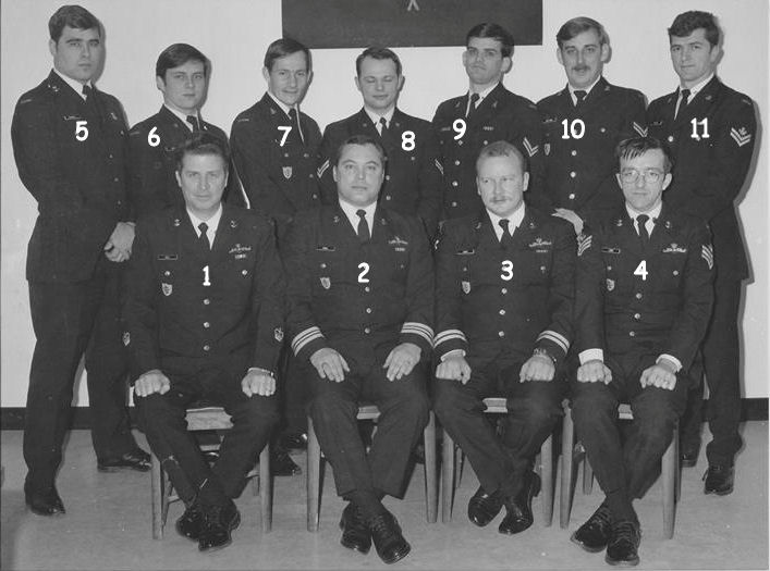 (1) Daly, B., PO (Instructor) (2) Jones, T., LCdr (3) Hawes, W., Lt (4) Lewis, J., PO2 (Instructor) (5) Parrell, OS (6) Donovan, OS (7) McLeod, OS (8) Conroy, LS (9) Wahlman, LS (10) Halfyard, LS (11) Travers, MS