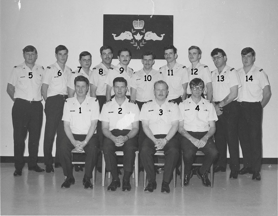 (1) Daly, B., PO1 (Instructor) (2) Bell, J., Cdr (Sub Squadron CO) (3) Hawes, W., Lt (Sub School Officer) (4) Lewis, J., PO2 (Instructor) (5) Byzewski, G., MS (6) Phaneuf, Rick, ABSN (7) Boughton, D., Cpl (8) Fraser, M., AB (9) Dulude, C., Pte (10) Farler, T., AB (11) Pallard, M., AB (12) McKeand, AB (13) Pollock, R., Sgt (14) Godbout, C., AB